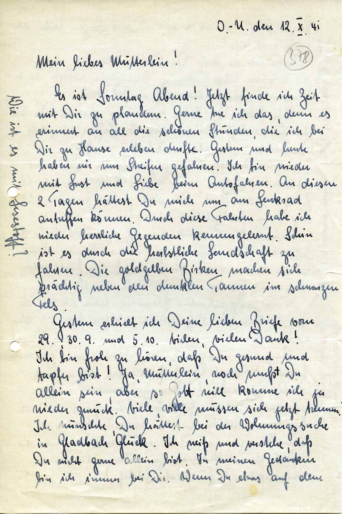 Gestern erhielt ich Deine lieben Briefe vom 29., 30.9. und 5.10. Vielen, vielen Dank! Ich bin froh zu hören, daß Du gesund und tapfer bist! Ja, Mütterlein, noch mußt Du allein sein, aber so Gott will komme ich ja wieder zurück. Viele, viele müssen sich jetzt trennen. Ich wünschte, Du hättest bei der Wohnungssuche in Gladbach Glück. Ich weiß und verstehe, daß Du nicht gerne allein bist. In meinen Gedanken bin ich immer bei Dir. Wenn Du etwas auf dem