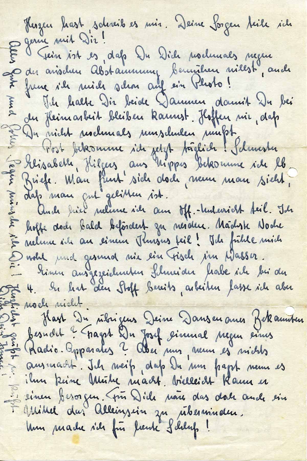 Hast Du übrigens Deine Dausenauer Bekannten besucht? Fragst Du Josef einmal wegen eines Radio-Apparates? Aber nur, wenn es nichts ausmacht. Ich weiß, daß Du nur fragst wenn es ihm keine Mühe macht. Vielleicht kann er einen besorgen. Für Dich wäre das doch auch ein Mittel das Alleinsein zu überwinden.