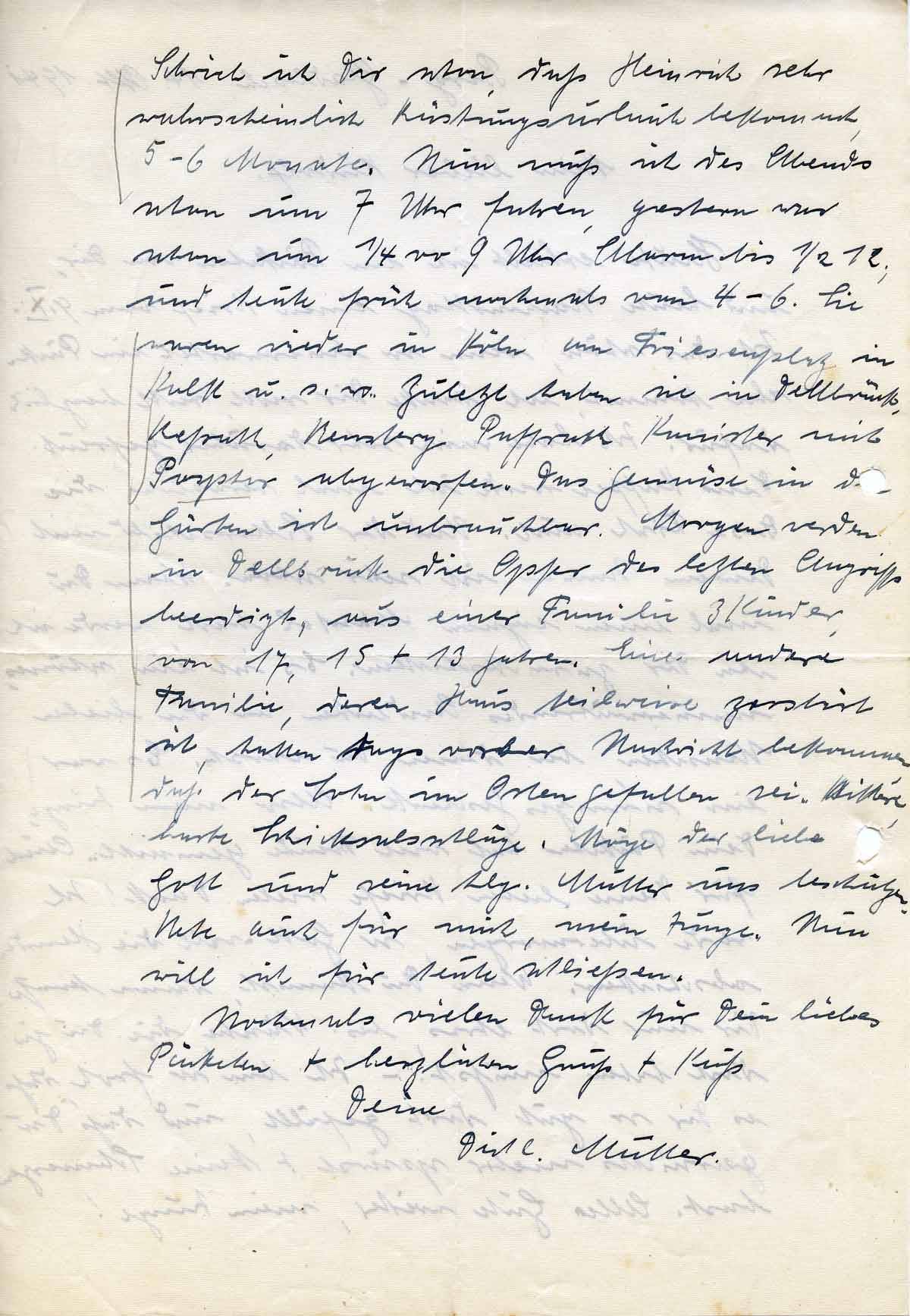 Schrieb ich Dir schon, daß Heinrich sehr wahrscheinlich Rüstungsurlaub bekommt, 5-6 Monate. Nun muß ich des Abends schon um 7 Uhr fahren, gestern war schon um ¼ vor 9 Uhr Alarm bis ½ 12; und heute früh nochmals von 4-5. Sie waren wieder in Köln am Friesenplatz in Kalk u.s.w. Zuletzt habe sie in Dellbrück, Refrath, Bensberg, Paffrath Kanister mit Posphor abgeworfen. Das Gemüse in den Gärten ist unbrauchbar. Morgen werden in Dellbrück die Opfer des letzten Angriffs beerdigt, aus einer Familie 3 Kinder, von 17, 15 + 13 Jahren. Eine andere Familie, deren Haus teilweise zerstört ist, hatten tags vorher Nachricht bekommen, daß der Sohn im Osten gefallen sei. Bittere, harte Schicksalsschläge. Möge der liebe Gott und seine hlg. Mutter uns beschützen. Bete auch für mich, mein Junge. Nun will ich für heute schließen.