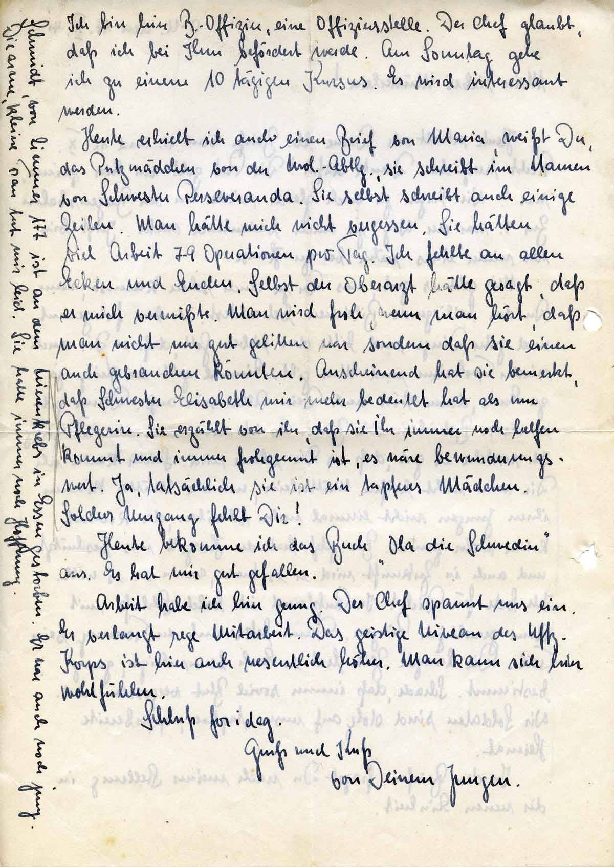 Heute erhielt ich auch einen Brief von Maria, weißt Du, das Putzmädchen von der Urol.-Abtlg., sie schreibt im Namen von Schwester Perseveranda. Sie selbst schreibt auch einige Zeilen. Man hätte mich nicht vergessen. Sie hätten viel Arbeit 79 Operationen pro Tag. Ich fehlte an allen Ecken und Enden. Selbst der Oberarzt hätte gesagt, daß er mich vermißte. Man wird froh, wenn man hört, daß man nicht nur gut gelitten war sondern daß sie einen auch gebrauchen könnten. Anscheinend hat sie bemerkt, daß Schwester Elisabeth mir mehr bedeutet hat als nur Pflegerin. Sie erzählt von ihr, daß sie ihr immer noch helfen kommt und immer frohgemut ist, es wäre bewunderungswert. Ja, tatsächlich sie ist ein tapferes Mädchen. Solcher Umgang fehlt Dir!