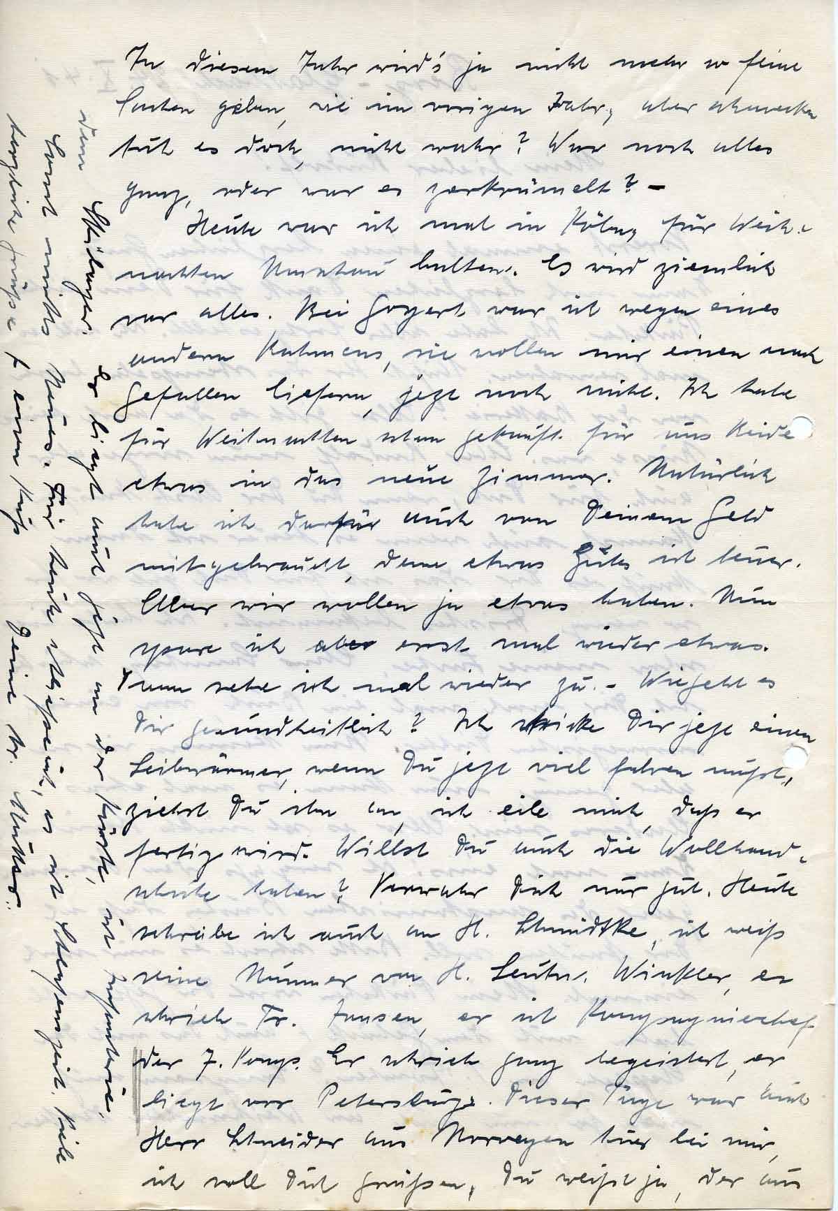 Heute war ich mal in Köln, für Weihnachten Umschau halten. Es wird ziemlich rar alles. Bei Goyert war ich wegen eines andern Rahmens, sie sollen mir einen nach Gefallen liefern, jetzt noch nicht. Ich habe für Weihnachten schon gekauft für uns Beide etwas in das neue Zimmer. Natürlich habe ich dafür auch von Deinem Geld mitgebraucht, denn etwas Gutes ist teuer. Aber wir wollen ja etwas haben. Nun spare ich aber erst mal wieder etwas. Dann sehe ich mal wieder zu. – Wie geht es Dir gesundheitlich? Ich stricke Dir jetzt einen Leibwärmer, wenn Du jetzt viel fahren mußt, ziehst Du ihn an, ich eile mich, daß er fertig wird. Willst Du auch die Wollhandschuhe haben? Verwahr Dich nur gut. Heute schreibe ich auch an H. Schmidtke, ich weiß seine Nummer von H. Leutn. Winkler, er schrieb Fr. Jansen, er ist Kompagniechef der 7. Komp. Er schrieb ganz begeistert, er liegt vor Petersburg. Dieser Tage war auch Herr Schneider aus Norwegen hier bei mir, ich soll Dich grüßen, Du weißt ja, der aus