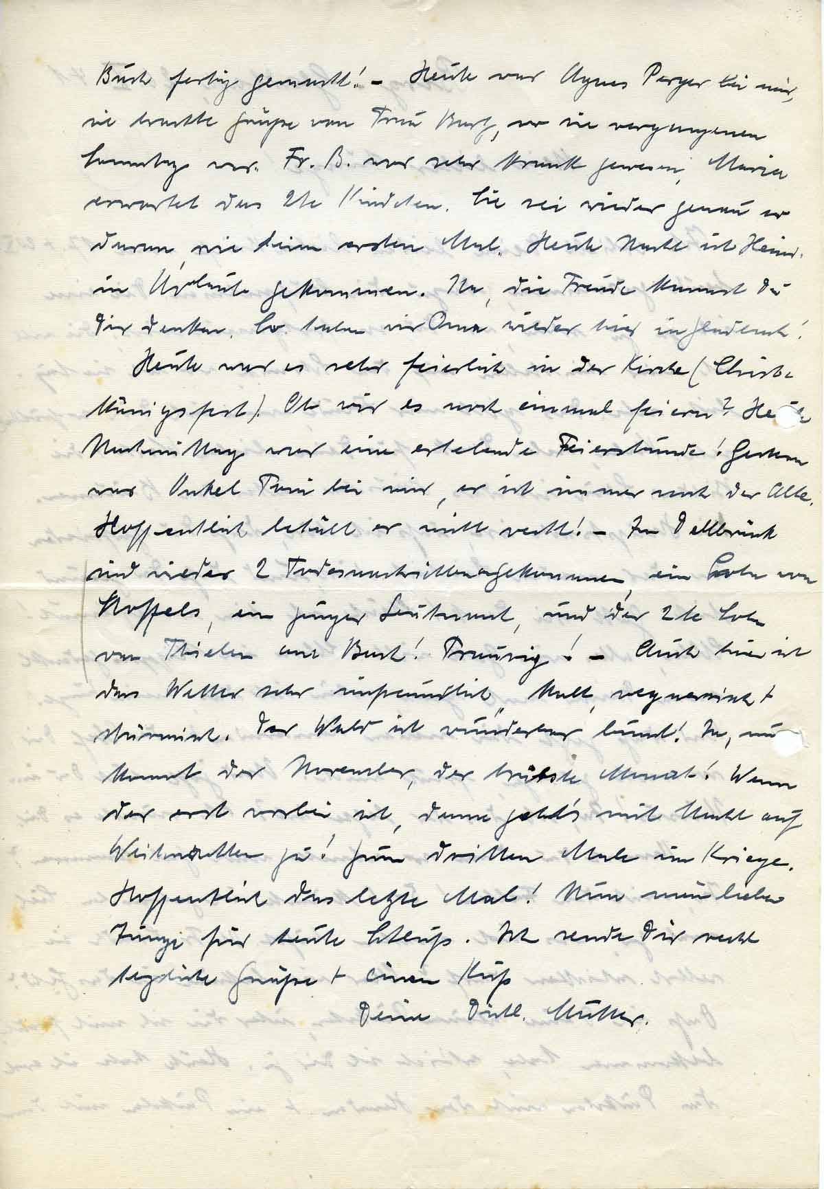 Heute war es sehr feierlich in der Kirche (Christkönigsfest). Ob wir es noch einmal feiern? Heute Nachmittag war eine erhebende Feierstunde! Gestern war Onkel Toni bei mir, er ist immer noch der Alte. Hoffentlich behält er nicht recht! – In Dellbrück sind wieder 2 Todesnachrichten angekommen, ein Sohn von Stoffels, ein junger Leutnant, und der 2te Sohn von Thielen am Bach[?]! Traurig! – Auch hier ist das Wetter sehr unfreundlich, kalt, regnerisch + stürmisch. Der Wald ist wunderbar bunt! Ja, nun kommt der November, der trübste Monat! Wenn der erst vorbei ist, dann geht’s mit Macht auf Weihnachten zu! Zum dritten Male im Kriege. Hoffentlich das letzte Mal! Nun mein lieber Junge für heute Schluß. Ich sende Dir recht herzliche Grüße + einen Kuß