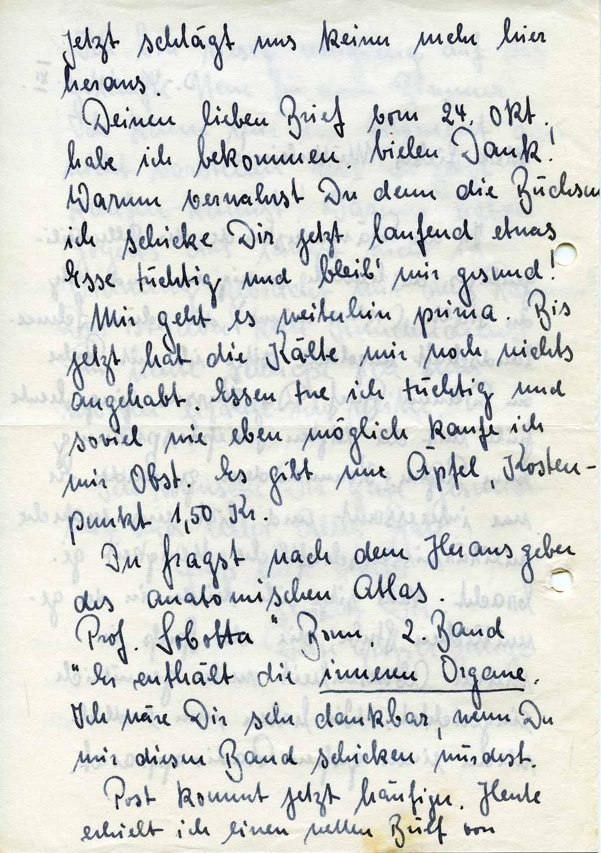 Mir geht es weiterhin prima. Bis jetzt hat die Kälte mir noch nichts angehabt. Essen tue ich tüchtig und soviel wie eben möglich kaufe ich mir Obst. Es gibt nur Äpfel, Kostenpunkt 1,50 Kr.