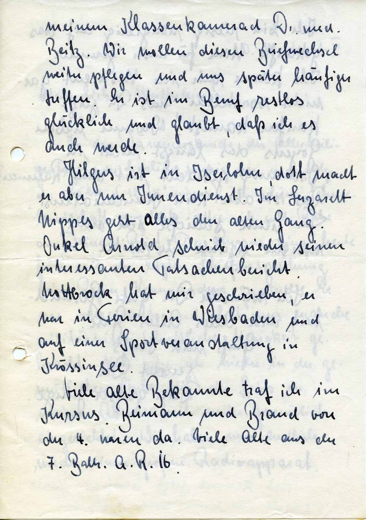 meinem Klassenkamerad Dr. med. Beitz. Wir wollen diesen Briefwechsel weiter pflegen und uns später häufiger treffen. Er ist im Beruf restlos glücklich und glaubt, daß ich es auch werde.