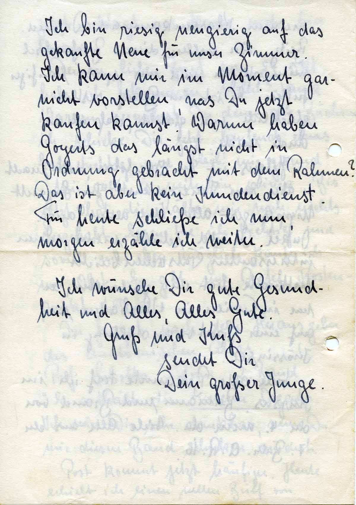 Ich bin riesig neugierig auf das gekaufte Neue für unser Zimmer. Ich kann mir im Moment garnicht vorstellen, was Du jetzt kaufen kannst. Warum haben Goyerts das längst nicht in Ordnung gebracht mit dem Rahmen? Das ist aber kein Kundendienst. Für heute schließe ich nun, morgen erzähle ich weiter.