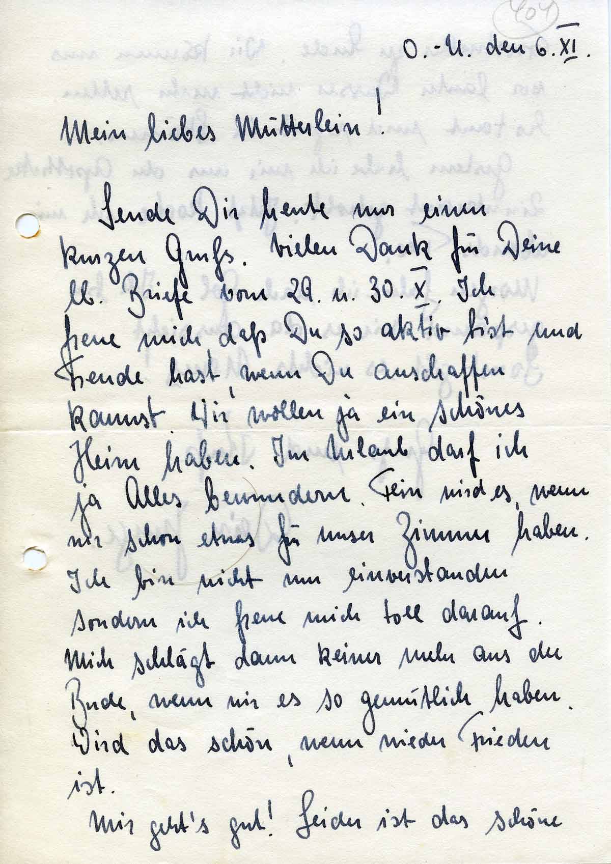 Sende Dir heute nur einen kurzen Gruß. Vielen Dank für Deine lb. Briefe vom 29. u. 30.X. Ich freue mich, daß Du so aktiv bist und Freude hast, wenn Du anschaffen kannst. Wir wollen ja ein schönes Heim haben. Im Urlaub darf ich ja Alles bewundern. Fein wird es, wenn mir schon etwas für unser Zimmer haben. Ich bin nicht nur einverstanden sondern ich freue mich toll darauf. Mich schlägt dann keiner mehr aus der Bude, wenn wir es so gemütlich haben. Wird das schön, wenn wieder Frieden ist.