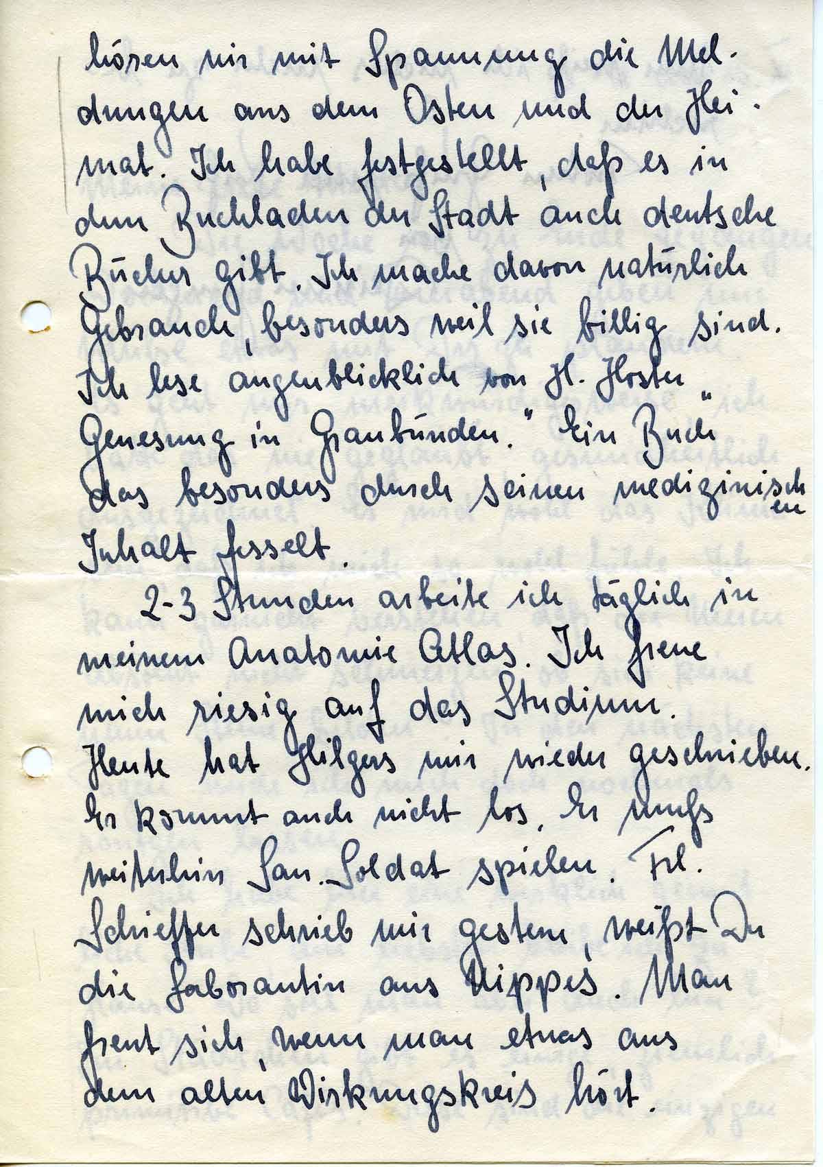 2-3 Stunden arbeite ich täglich in meinem Anatomie Atlas. Ich freue mich riesig auf das Studium. Heute hat Hilgers mir wieder geschrieben. Er kommt auch nicht los. Er muß weiterhin San. Soldat spielen. Frl. Schieffer schrieb mir gestern, weißt Du die Laborantin aus Nippes. Man freut sich, wenn man etwas aus dem alten Wirkungskreis hört.