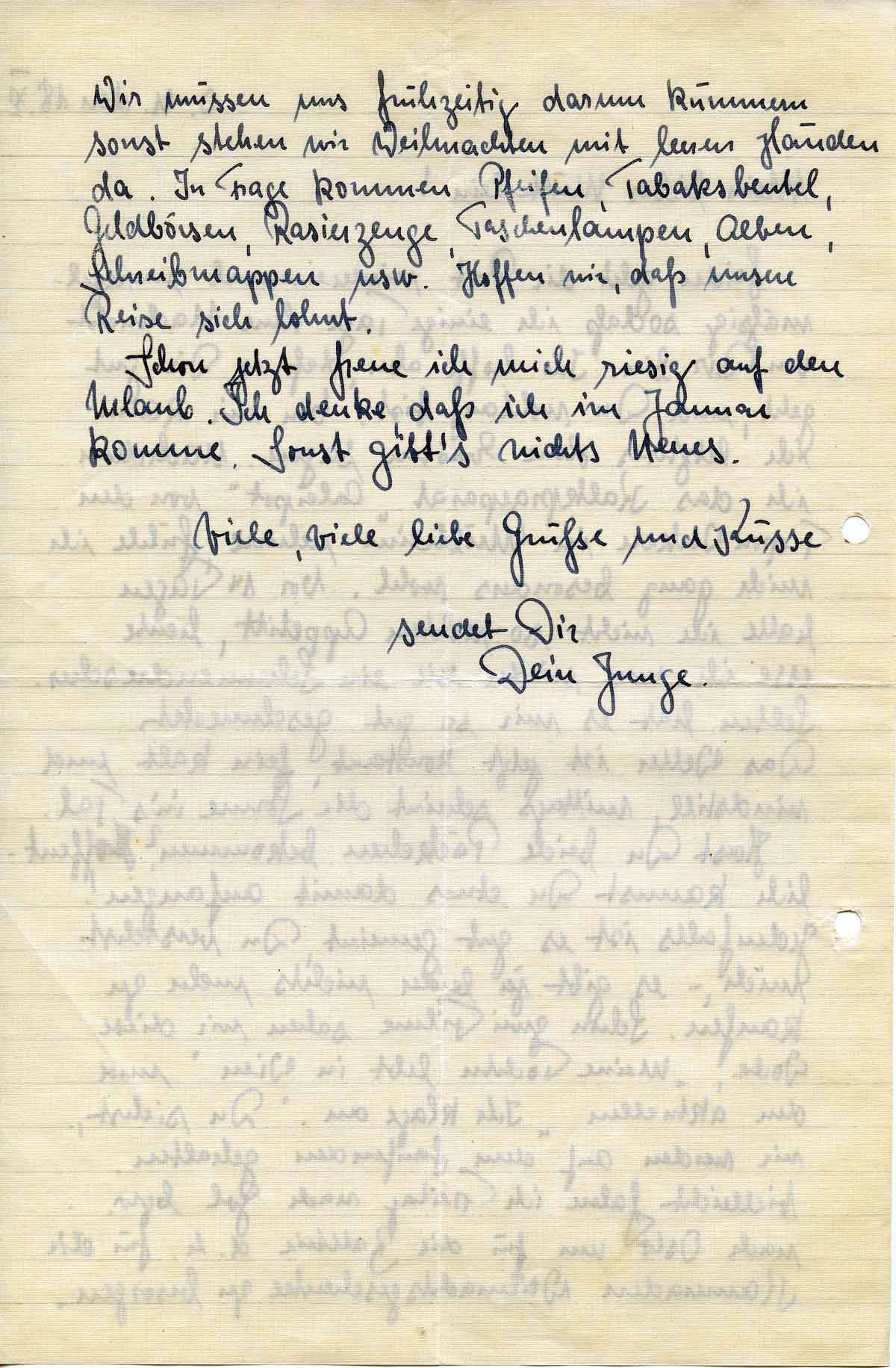 Wir müssen uns frühzeitig darum kümmern sonst stehen wir Weihnachten mit leeren Händen da. In Frage kommen Pfeifen, Tabaksbeutel, Geldbörsen, Rasierzeuge, Taschenlampen, Alben, Schreibmappen usw. Hoffen wir, daß unsere Reise sich lohnt.