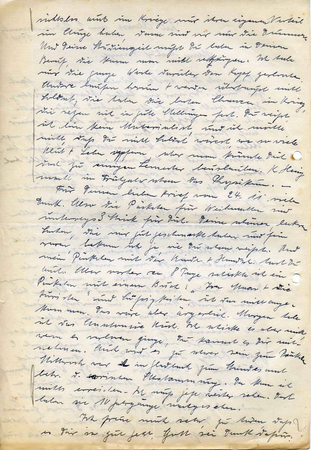 sichtslos auch im Kriege nur ihren eigenen Vorteil im Auge haben, dann sind wir nur die Dummen. Und Deine Studienzeit mußt Du haben in Deinem Beruf, die kann man nicht verkürzen. Ich habe mir die ganze Woche darüber den Kopf zerbrochen. Andere laufen herum + werden überhaupt nicht Soldat, die haben die besten Chancen im Krieg, die setzen sich in gute Stellungen fest. Du weißt, ich bin kein Materialist, und ich möchte nicht, daß Du nicht Soldat wärest, wo so viele Blut + Leben opfern, aber man könnte Dich doch zu einigen Semester beurlauben. K. Heinz macht im Frühjahr schon das Physikum. –