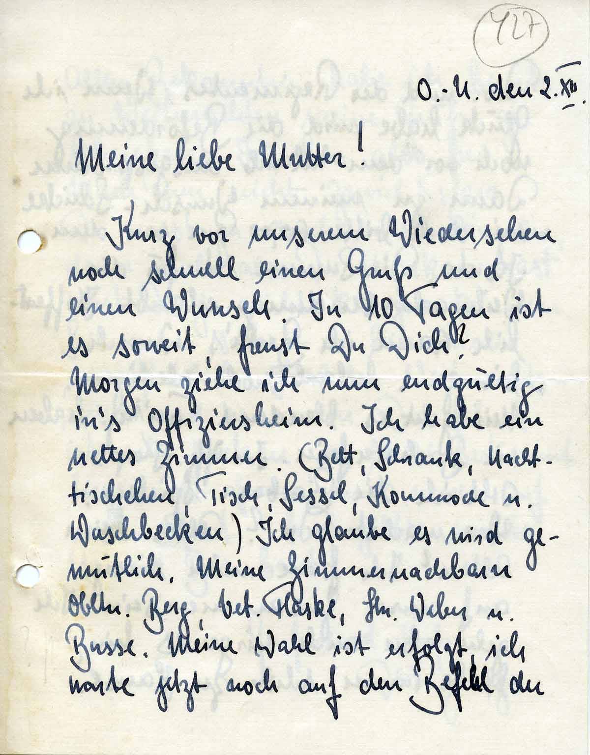 Kurz vor unserem Wiedersehen noch schnell einen Gruß und einen Wunsch. In 10 Tagen ist es soweit, freust Du Dich? Morgen ziehe ich nun endgültig in’s Offiziersheim. Ich habe ein nettes Zimmer. (Bett, Schrank, Nachttischchen, Tisch, Sessel, Kommode u. Waschbecken) Ich glaube es wird gemütlich. Meine Zimmernachbarn Obltn. Berg, Vet. Flaske, Stn. Weber u. Busse. Meine Wahl ist erfolgt, ich warte jetzt noch auf den Befehl der