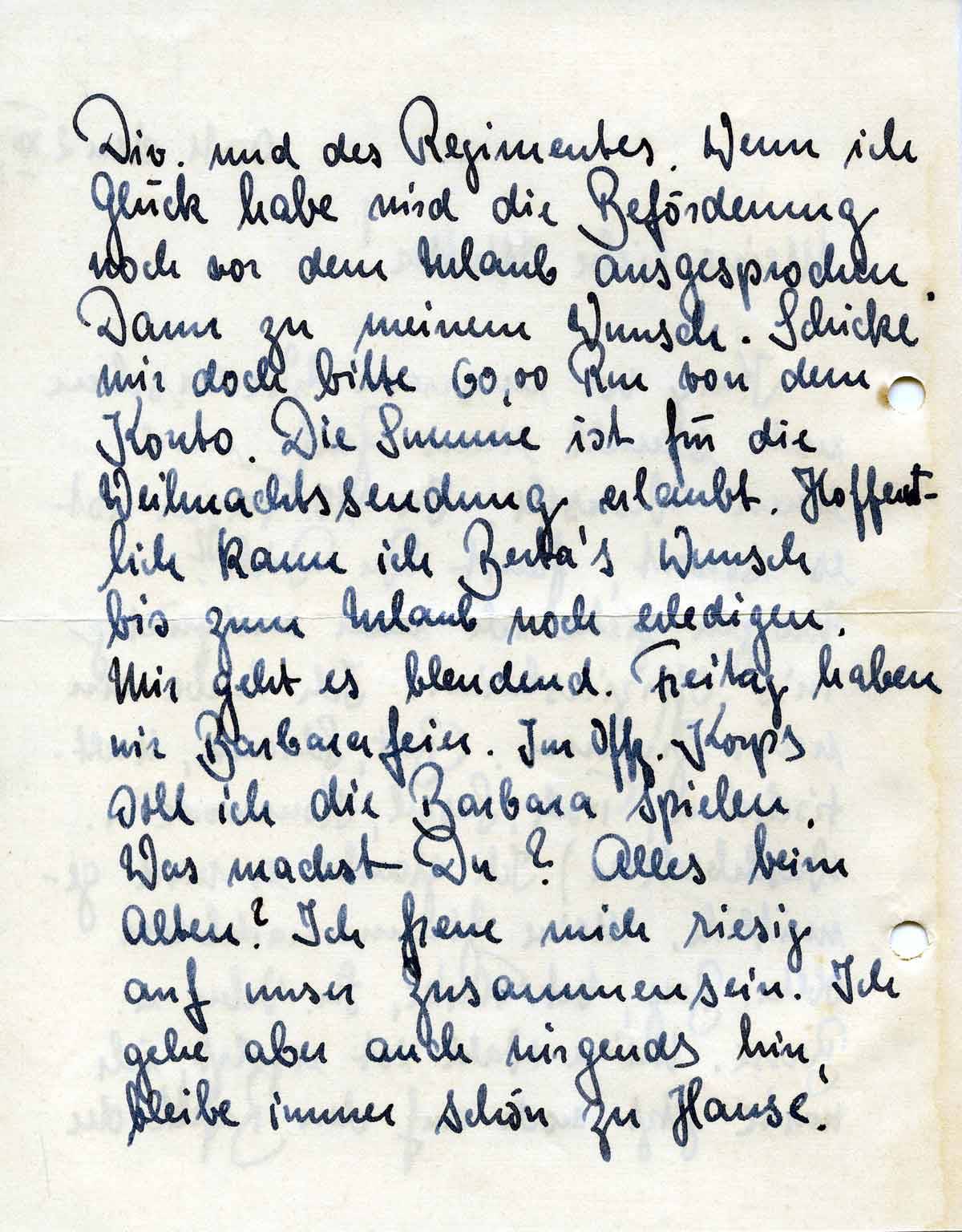 Div. und des Regimentes. Wenn ich Glück habe wird die Beförderung noch vor dem Urlaub ausgesprochen. Dann zu meinem Wunsch. Schicke mir doch bitte 60,00 Rm von dem Konto. Die Summe ist für die Weihnachtssendung erlaubt. Hoffentlich kann ich Berta’s Wunsch bis zum Urlaub noch erledigen. Mir geht es blendend. Freitag haben wir Barbarafeier. Im Offz. Korps soll ich die Barbara spielen. Was machst Du? Alles beim Alten? Ich freue mich riesig auf unser Zusammensein. Ich gehe aber auch nirgends hin, bleibe immer schön zu Hause.