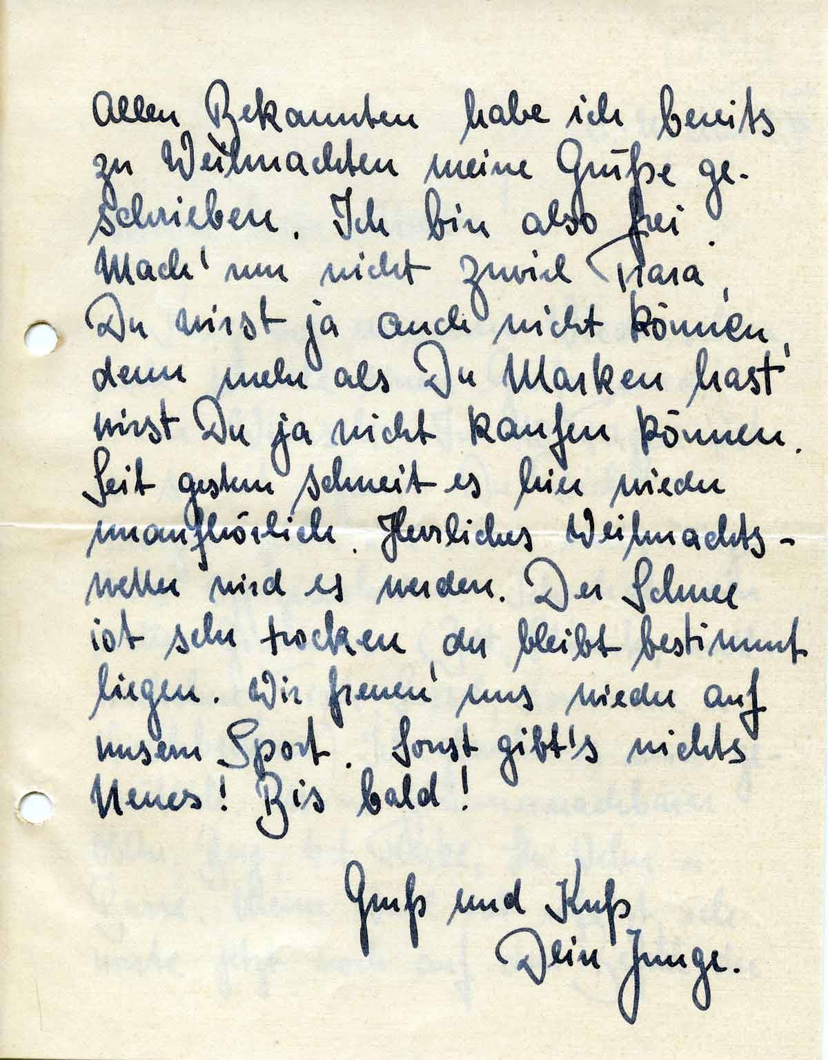 Allen Bekannten habe ich bereits zu Weihnachten meine Grüße geschrieben. Ich bin also frei. Mach‘ nur nicht zuviel Trara, Du wirst ja auch nicht können, denn mehr als Du Marken hast wirst Du ja nicht kaufen können. Seit gestern schneit es hier wieder unaufhörlich. Herrliches Weihnachtswetter wird es werden. Der Schnee ist sehr trocken, der bleibt bestimmt liegen. Wir freuen uns wieder auf unsern Sport. Sonst gibt’s nichts Neues! Bis bald!