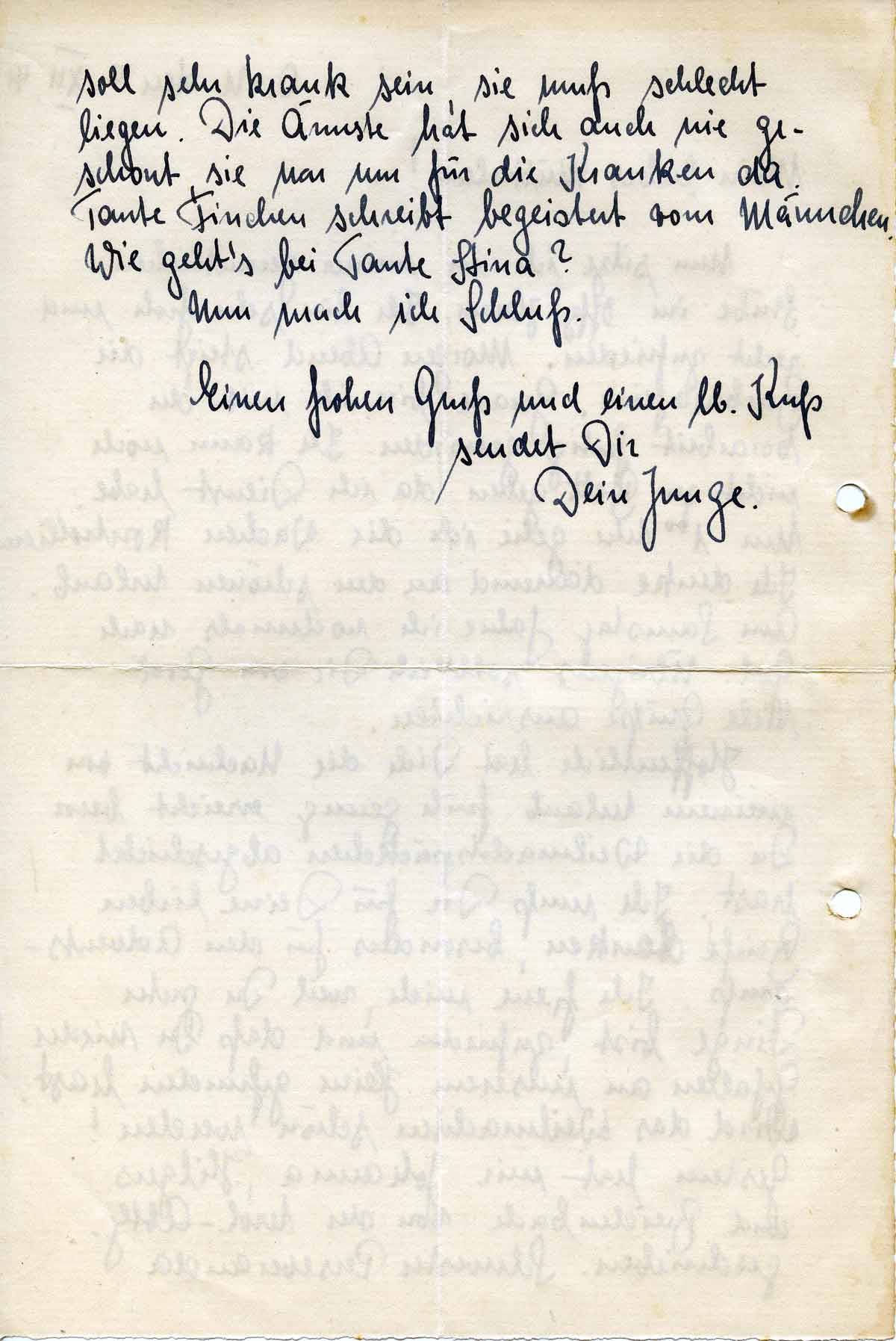soll sehr krank sein, sie muß schlecht liegen. Die Ärmste hat sich auch nie geschont, sie war nur für die Kranken da. Tante Finchen schreibt begeistert vom Männchen. Wie geht’s bei Tante Stina!