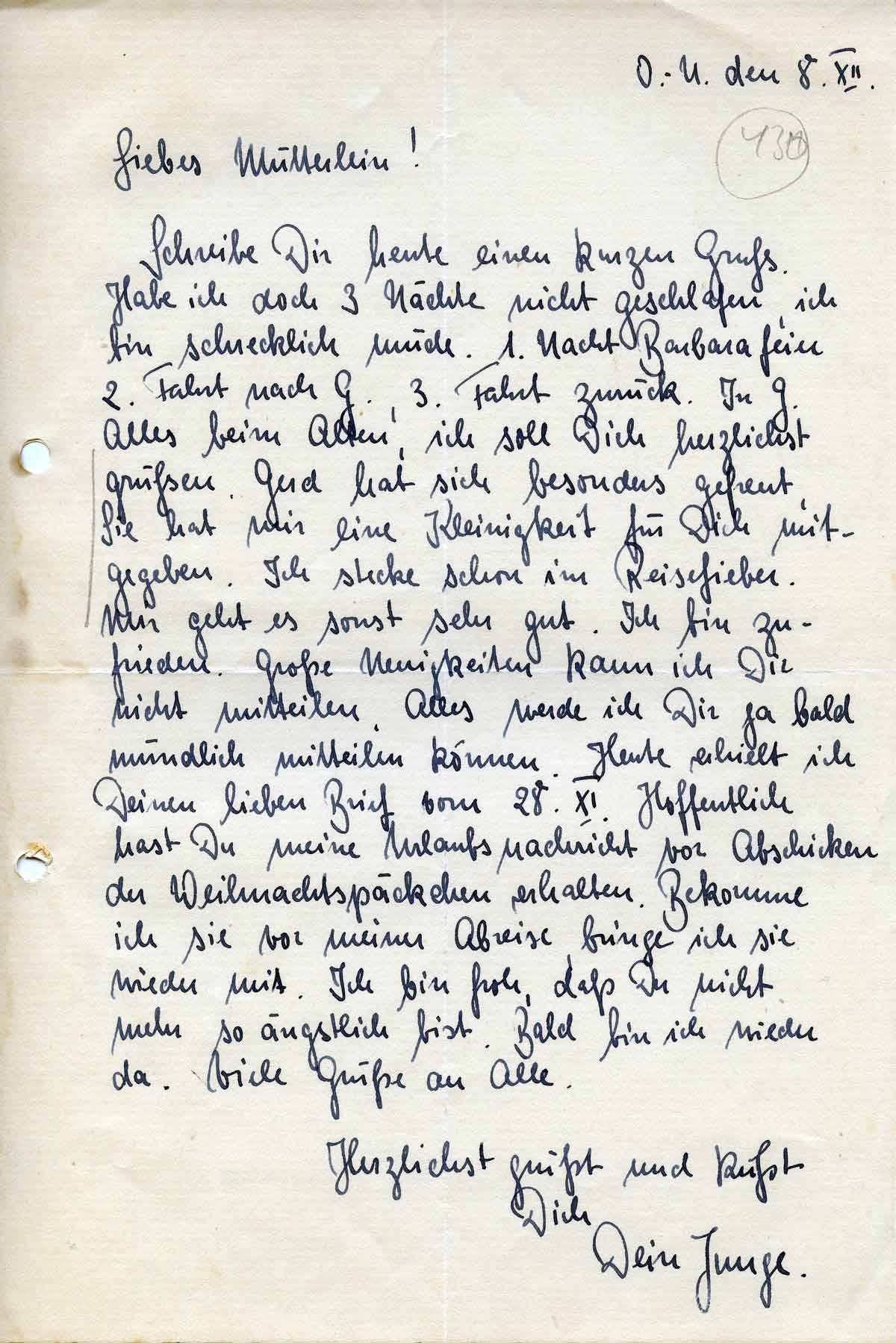 Schreibe Dir heute einen kurzen Gruß. Habe ich doch 3 Nächte nicht geschlafen, ich bin schrecklich müde. 1. Nacht Barbarafeier 2. Fahrt nach G., 3. Fahrt zurück. In G. Alles beim Alten, ich soll Dich herzlichst grüßen. Gerd hat sich besonders gefreut. Sie hat mir eine Kleinigkeit für Dich mitgegeben. Ich stecke schon im Reisefieber. Mir geht es sonst sehr gut. Ich bin zufrieden. Große Neuigkeiten kann ich Dir nicht mitteilen. Alles werde ich Dir ja bald mündlich mitteilen können. Heute erhielt ich Deinen lieben Brief vom 28.XI. Hoffentlich hast Du meine Urlaubsnachricht vor Abschicken der Weihnachtspäckchen erhalten. Bekomme ich sie vor meiner Abreise, bringe ich sie wieder mit. Ich bin froh, daß Du nicht mehr so ängstlich bist. Bald bin ich wieder da. Viele Grüße an Alle.
