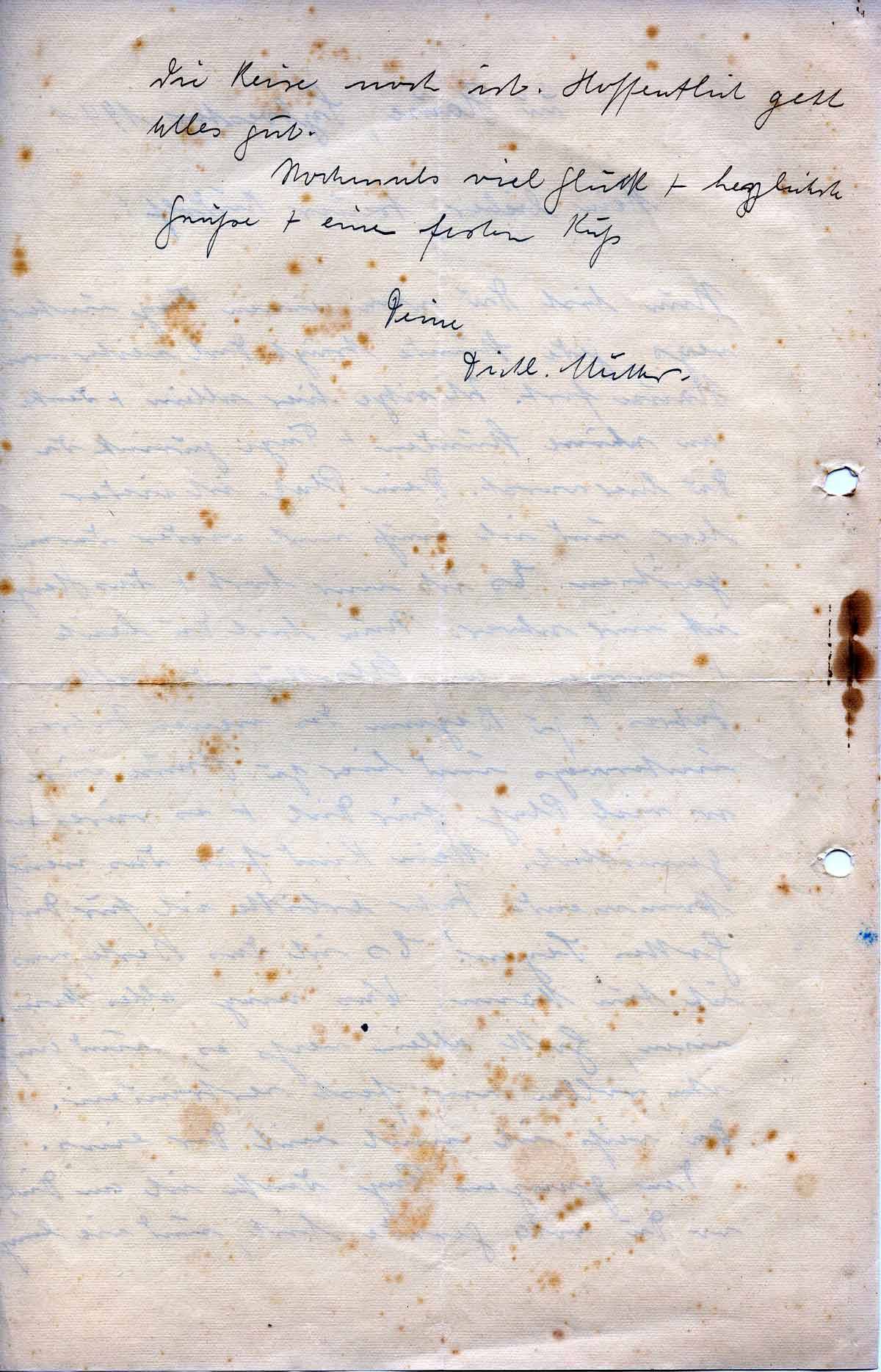 Nun bist Du schon einen Tag unterwegs, jede Stunde trägt Dich weiter von Hause fort. Ich sitze hier allein + denke an schöne Stunden + Tage zurück, da Du hier warst. Dein Platz ist wieder leer, und ich muß mich wieder daran gewöhnen. Es ist mir hart + das Herz ist mir schwer. Nun bist Du heute + morgen, am Abschluß des alten Jahres + zu Beginn des neuen Jahres unterwegs und hier zu Hause wäre so viel Platz für Dich + es wäre so gemütlich. Mein Kind für das neue, kommende Jahre erbitte ich für Dich Gottes Segen! Es ist das Beste, was ich tun kann. Was mag alles kommen, Gott allein weiß es, und auf ihn wollen wir fest vertrauen. Da weiß ich mich mit Dir eins.