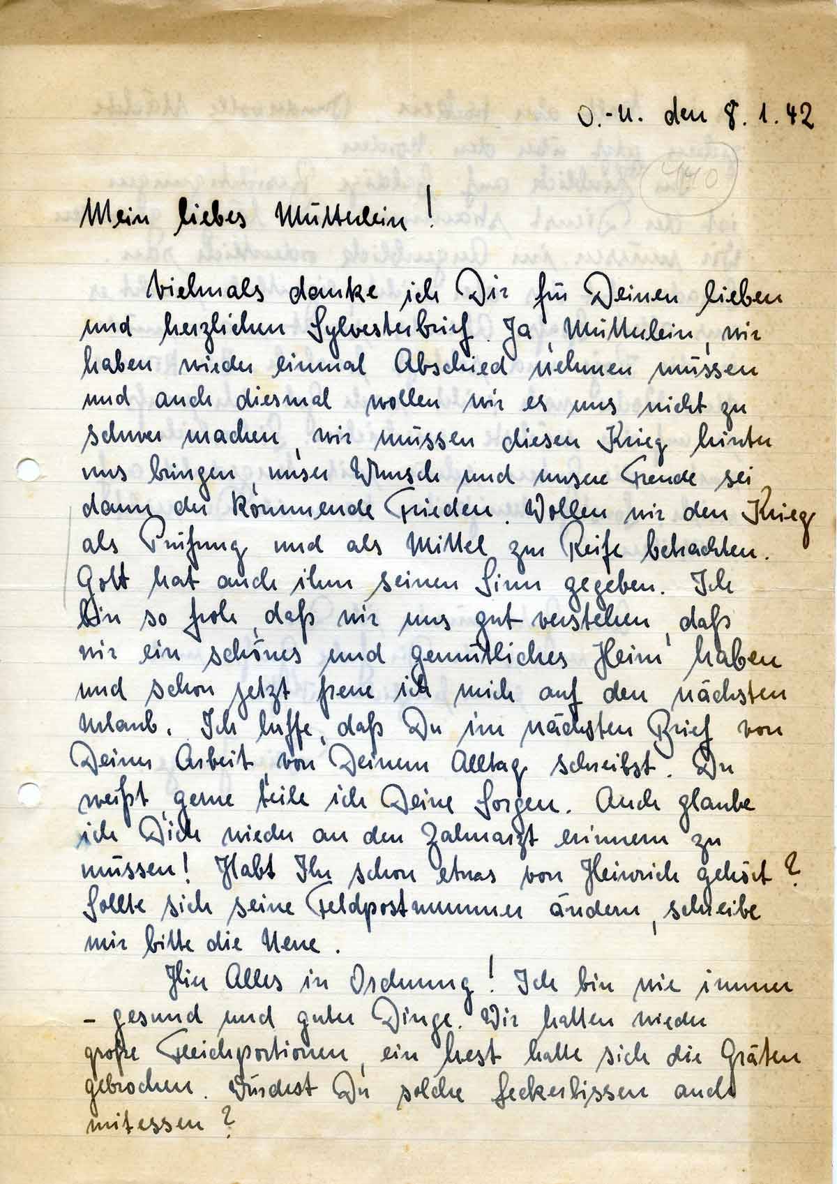 Vielmals danke ich Dir für Deinen lieben und herzlichen Sylvesterbrief. Ja, Mütterlein, wir haben wieder einmal Abschied nehmen müssen und auch diesmal wollen wir es uns nicht zu schwer machen, wir müssen diesen Krieg hinter uns bringen, unser Wunsch und unsere Freude sei dann der kommende Frieden. Wollen wir den Krieg als Prüfung und als Mittel zur Reife betrachten. Gott hat auch ihm seinen Sinn gegeben. Ich bin so froh, daß wir uns gut versehen, daß wir ein schönes und gemütliches Heim haben und schon jetzt freue ich mich auf den nächsten Urlaub. Ich hoffe, daß Du im nächsten Brief von Deiner Arbeit, von Deinem Alltag schreibst. Du weißt, gerne teile ich Deine Sorgen. Auch glaube ich Dich wieder an den Zahnarzt erinnern zu müssen! Habt Ihr schon etwas von Heinrich gehört? Sollte sich seine Feldpostnummer ändern, schreibe mir bitte die Neue.