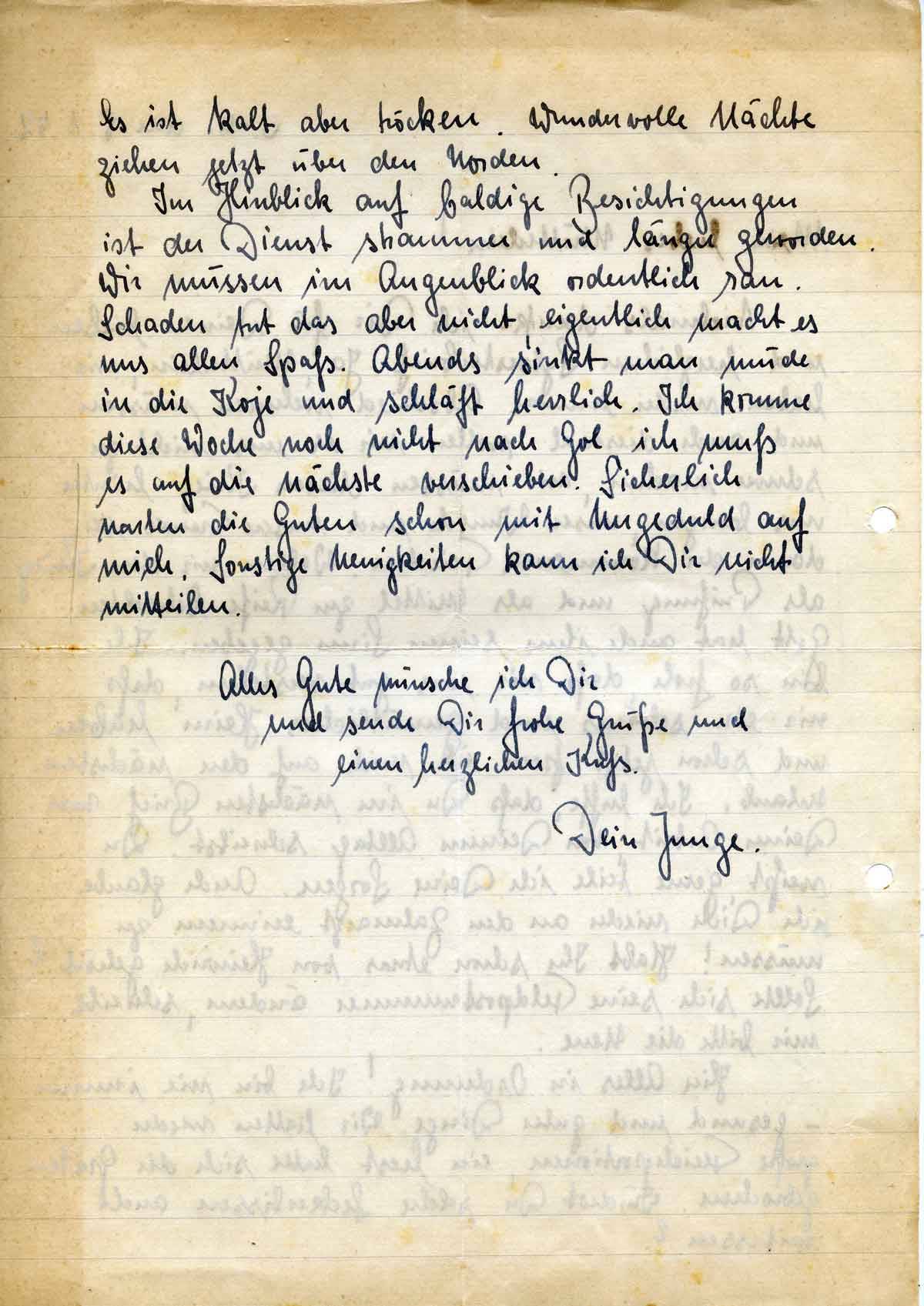 Im Hinblick auf baldige Besichtigungen ist der Dienst strammer und länger geworden. Wir müssen im Augenblick ordentlich ran. Schaden tut das aber nicht, eigentlich macht es uns allen Spaß. Abends sinkt man müde in die Koje und schläft herrlich. Ich komme diese Woche noch nicht nach Gol, ich muß es auf die nächste verschieben. Sicherlich warten die Guten schon mit Ungeduld auf mich. Sonstige Neuigkeiten kann ich Dir nicht mitteilen.