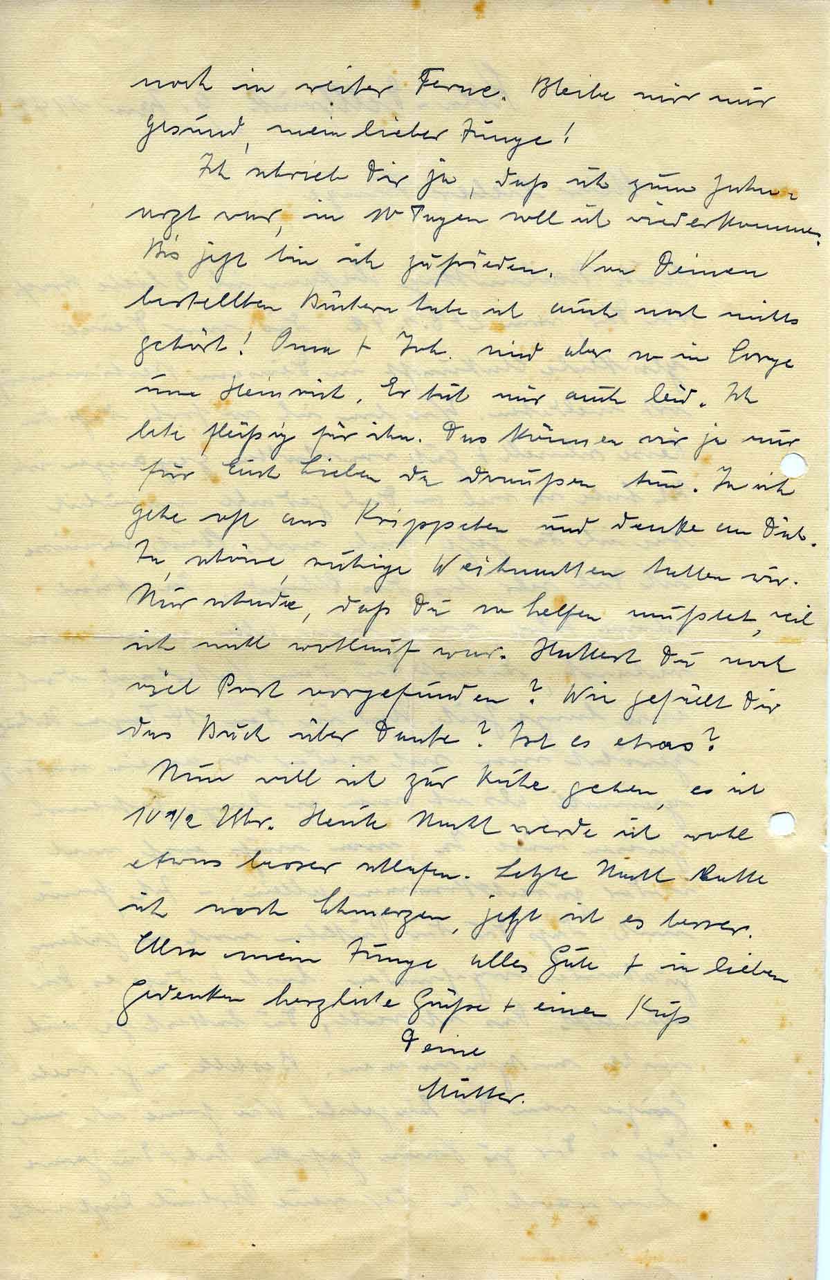 Nun will ich zur Ruhe gehen, es ist 10 ½ Uhr. Heute Nacht werde ich wohl etwas besser schlafen. Letzte Nacht hatte ich noch Schmerzen, jetzt ist es besser. Also mein Junge alles Gute + in lieben Gedenken herzliche Grüße + einen Kuß