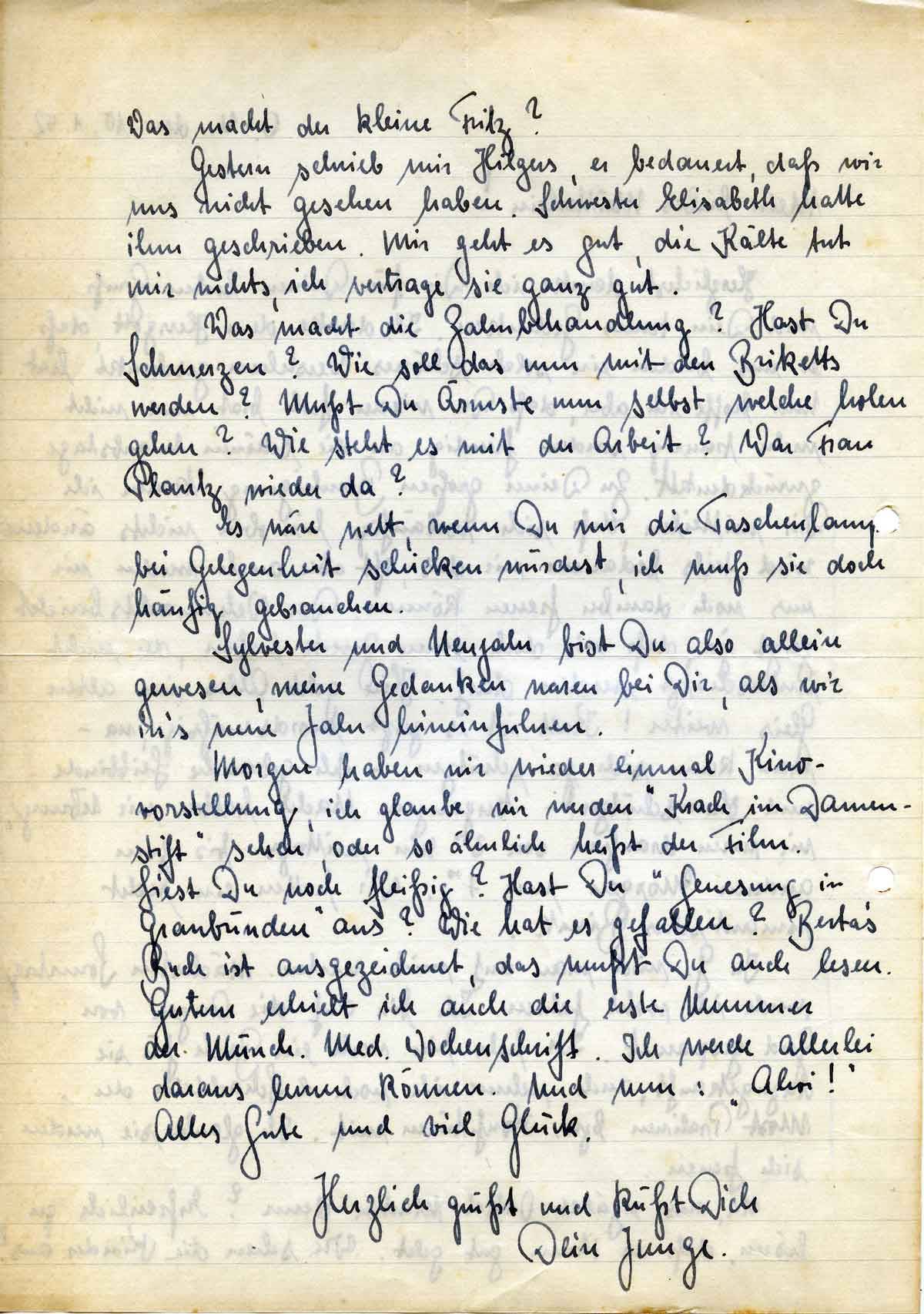 Morgen haben wir wieder einmal Kinovorstellung, ich glaube wir werden „Krach im Damenstift“ sehen, oder so ähnlich heißt der Film. Liest Du noch fleißig? Hast Du „Genesung in Graubünden“ aus? Wie hat es gefallen? Berta’s Buch ist ausgezeichnet, das mußt Du auch lesen. Gestern erhielt ich auch die erste Nummer der Münch. Med. Wochenschrift. Ich werde allerlei daraus lernen können. Und nun: „Ahoi!“ Alles Gute und viel Glück.