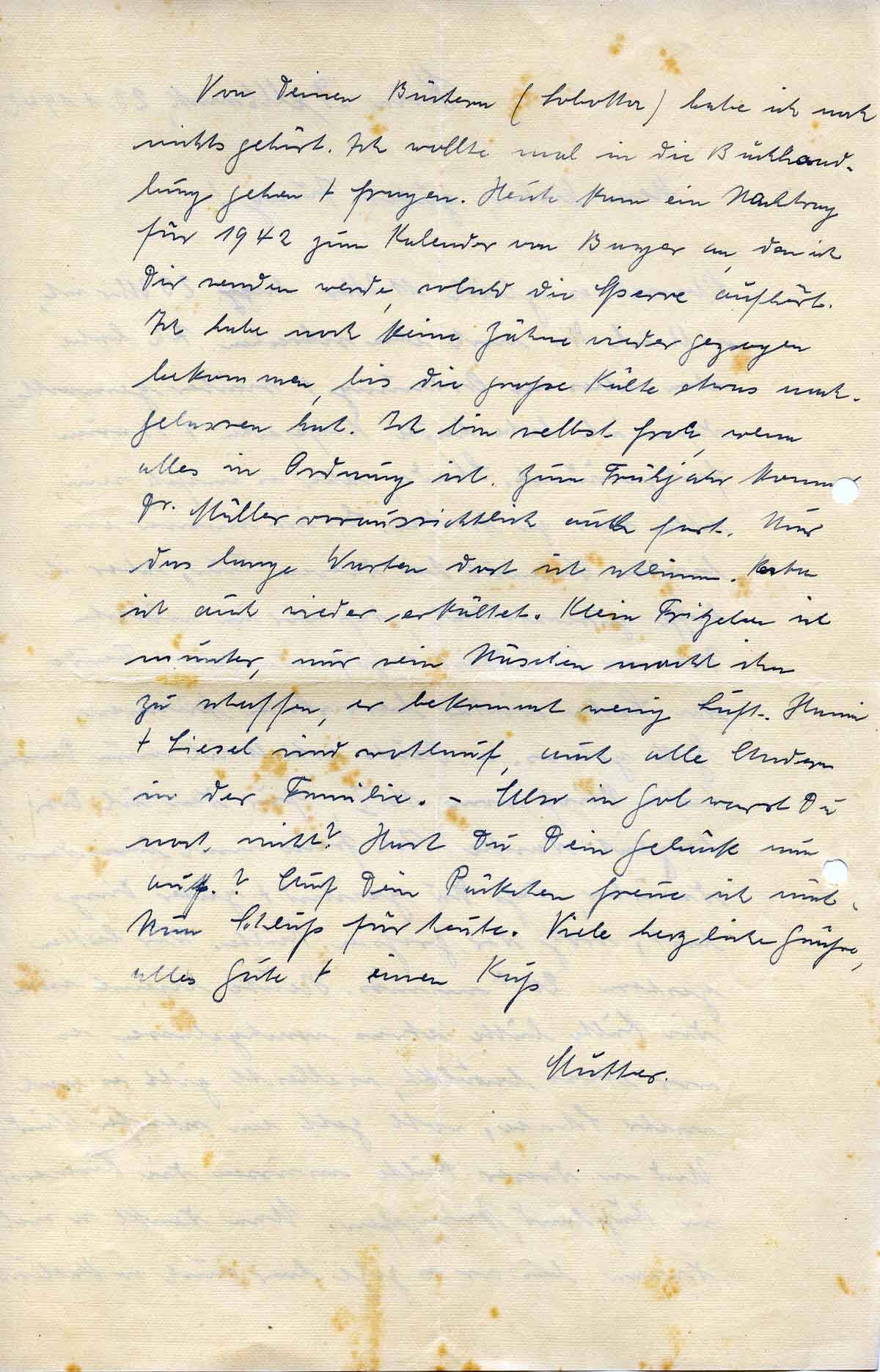 Von Deinen Büchern (Sobotta) habe ich noch nichts gehört. Ich wollte mal in die Buchhandlung gehen + fragen. Heute kam ein Nachtrag für 1942 zum Kalender von Bayer an, den ich Dir senden werde, sobald die Sperre aufhört. Ich habe noch keine Zähne wieder gezogen bekommen, bis die große Kälte etwas nachgelassen hat. Ich bin selbst froh, wenn alles in Ordnung ist. Zum Frühjahr kommt Der. Müller voraussichtlich auch fort. Nur das lange Warten dort ist schlimm. Berta ist auch wieder erkältet. Klein Fritzchen ist munter, nur sein Näschen macht ihm zu schaffen, er bekommt wenig Luft. Hanni + Liesel sind wohlauf, auch alle Andern in der Familie. – Also in Gol warst Du noch nicht? Hast Du Dein Gebäck nun auf? Auf Dein Päckchen freue ich mich. Nun Schluß für heute. Viele herzliche Grüße, alles Gute + einen Kuß