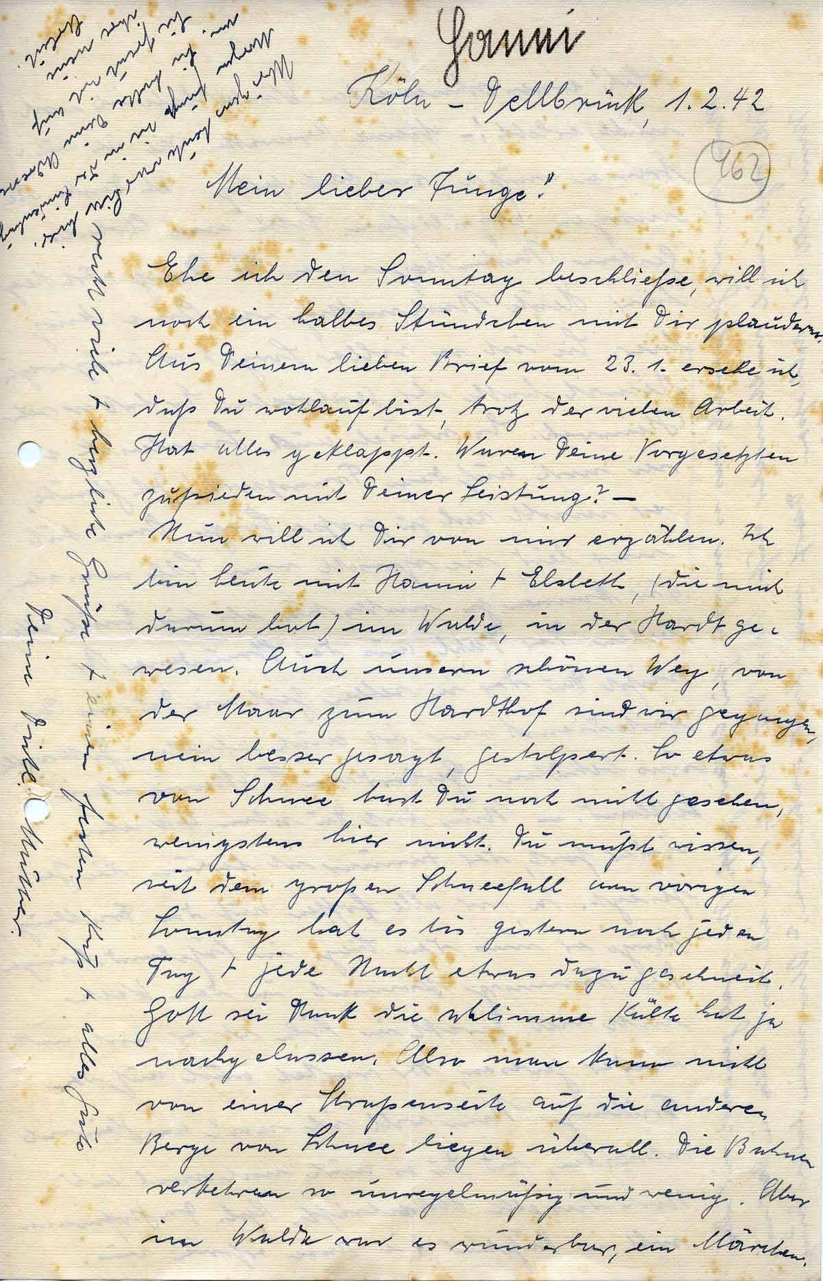 Solch‘ einen schneereichen Winter habe ich noch nicht erlebt! – Meine Krawatten, die ich auftrennen mußte, sind fast fertig. Ich denke, sie morgen abzuliefern. Solch eine Arbeit. Gestern Nachmittag waren Fr. Plantz + Frl. Heeg hier. Heute Nachmittag war Oma kurz hier. Sie ist so voller Sorge + so aufgeregt. Heinrich hatte ihr geschrieben. Er hat so sehr Heimweh. Er schrieb aus Smolensk, er sei noch auf dem Transport! Ich glaube, er macht sich zu große Sorge. Oma tut mir leid, sie spricht vom Schlimmsten. Wir können ja nichts tun als für Euch alle beten. Der Dahl aus der Strundener Str., weißt Du, der in selben Zeit wie Du im Arbeitsdienst war, ist auch gefallen. Gott wolle uns behüten. Gerhard von T. Marie ist in Lettland. – Nun bist Du schon 4 Wochen wieder fort, der Januar ist herum, die Zeit fliegt. Ja, wir alle hoffen auf den Frühling. Möge er uns den Sieg in Rußland bringen. Der Tommy kommt in dem Wetter nicht viel. Direkt in Köln ist er noch nicht wieder gewesen, der wartet auch auf den Frühling. Nun will ich noch an Heinrich schreiben, tu Du es auch nochmal bald. Noch dieselbe Anschrift. Kpl. Dr. Hofmann soll in Rußland die Nase erfroren sein.