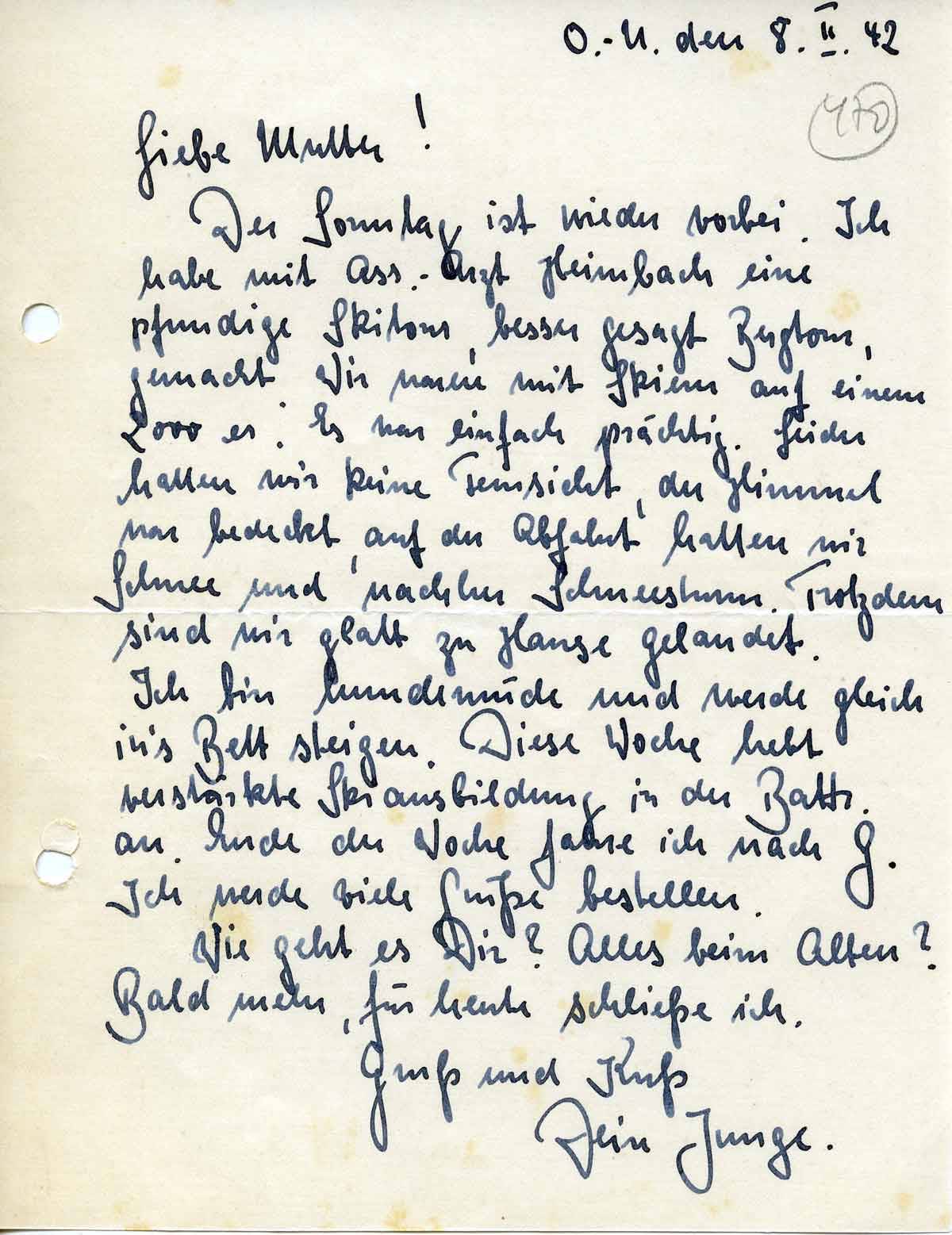 Der Sonntag ist wieder vorbei. Ich habe mit Ass.-Arzt Heimbach eine pfundige Skitour, besser gesagt Bergtour, gemacht. Wir waren mit Skiern auf einem 2000er. Es war einfach prächtig. Leider hatten wir keine Fernsicht, der Himmel war bedeckt, auf der Abfahrt hatten wir Schnee und nachher Schneesturm. Trotzdem sind wir glatt zu Hause gelandet. Ich bin hundemüde und werde gleich in’s Bett steigen. Diese Woche hebt verstärkte Skiausbildung in der Battr. an. Ende der Woche fahre ich nach G. Ich werde viele Grüße bestellen.