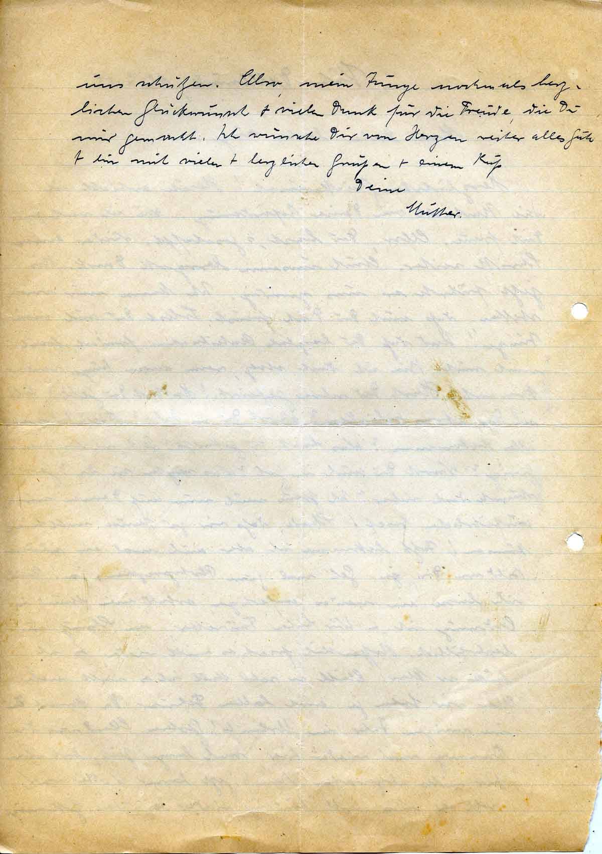 Herzlichen Glückwunsch! Heute erhielt ich die Nachricht von Deiner Beförderung. Wie ich mich für Dich freue. Also, Du hast’s geschafft. Wieder einen Schritt weiter. Auch unserm Herrgott Dank. Bis jetzt führte er uns gnädig. Ich kann mir vorstellen, daß auch Du Dich freust. Sollst Du auch mein Junge! Und daß Du herzliche Anteilnahme sendest, freut mich auch. Bin ich doch stolz, wenn mein Junge weiterkommt! Hast Du schon gefeiert? Hattest Du Geld? Soll ich Dir etwas schicken? Warst Du in Oslo? Hast Du noch alles bekommen? Was hast Du gekauft? Gelt, ich bin neugierig? Warst Du auch in Gol? Was sagten sie da? Gerd staunte doch sicher? Ich freue mich nun auf Deinen nächsten ausführlichen Brief! Schade, daß wir zu Hause nicht feiern können! Jetzt bekomme ich aber auch mal ein schönes Bild von Dir, ja. Geh‘ mal zum Photographen, ja! Auch ich lasse ein neues anfertigen, sobald mein Mund in Ordnung ist. – Wir haben Tauwetter, ein Schmutz unbeschreiblich. Hoffentlich friert es nicht wieder, es ist heute so klar. Auch so sehr kalt ist es nicht mehr. Aber wir haben ja auch halben Februar. Da kamst Du im vorigen Jahr in Urlaub! Gestern Abend war der Tommy mal wieder hier, nach langer Zeit, hat aber hier nichts abgeworfen. Wenn’s jetzt besser Wetter wird, soll er uns wohl häufig wieder besuchen. Gott möge