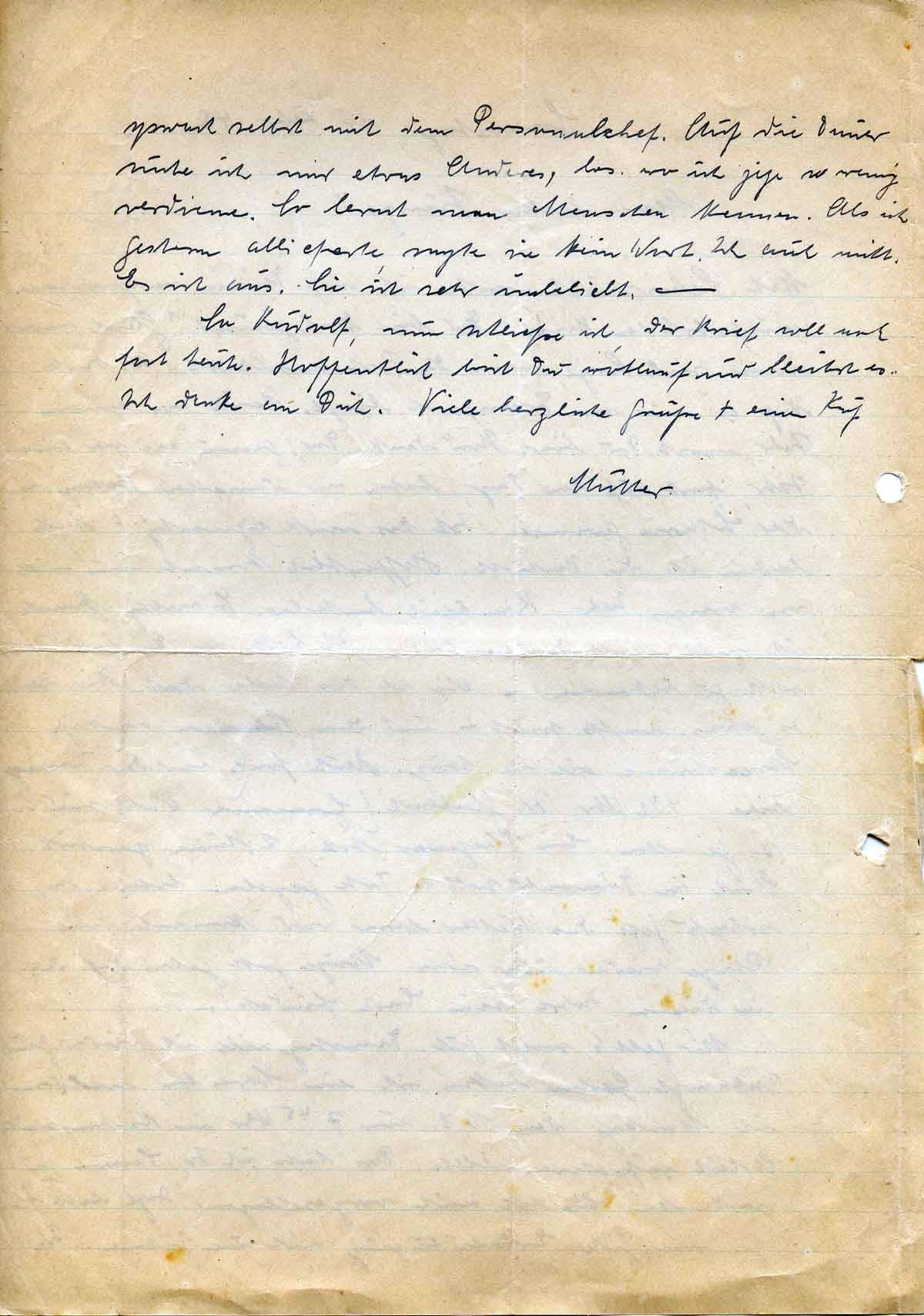 So Rudolf, nun schließe ich, der Brief soll noch fort heute. Hoffentlich bist Du wohlauf und bleibst es. Ich denke an Dich. Viele herzliche Grüße + einen Kuß