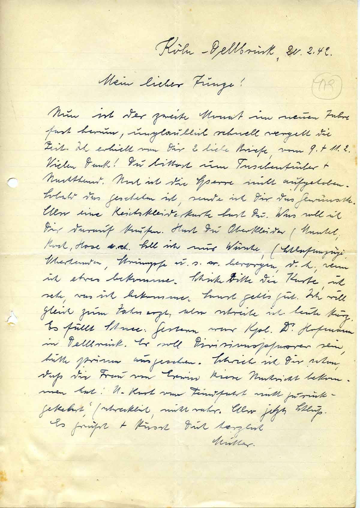 Nun ist der zweite Monat im neuen Jahre fast herum, unglaublich schnell vergeht die Zeit. Ich erhielt von Dir 2 liebe Briefe, vom 9. + 11.2. Vielen Dank! Du bittest um Taschentücher + Nachthemd. Noch ist die Sperre nicht aufgehoben. Sobald das geschehen ist, sende ich Dir das Gewünschte. Also eine Reichskleiderkarte hast Du. Was soll ich Dir darauf kaufen. Hast Du Oberkleider (Mantel, Rock, Hose e.ct. Soll ich nur Wäsche, (Schlafanzüge, Oberhemden, Strümpfe u.s.w. besorgen, d. h., wenn ich etwas bekomme. Schicke bitte die Karte, ich sehe, was ich bekomme. Sonst geht’s gut. Ich will gleich zum Zahnarzt, also schreibe ich heute kurz. Es fällt Schnee. Gestern war Kpl. Dr. Hofmann in Dellbrück. Er soll Divisionspfarrer sein, hätte prima ausgesehen. Schrieb ich Dir schon, daß die Frau von Erwin Riese Nachricht bekommen hat: U-Boot von Feindfahrt nicht zurückgekehrt“, (schrecklich, nicht wahr. Also jetzt Schluß.