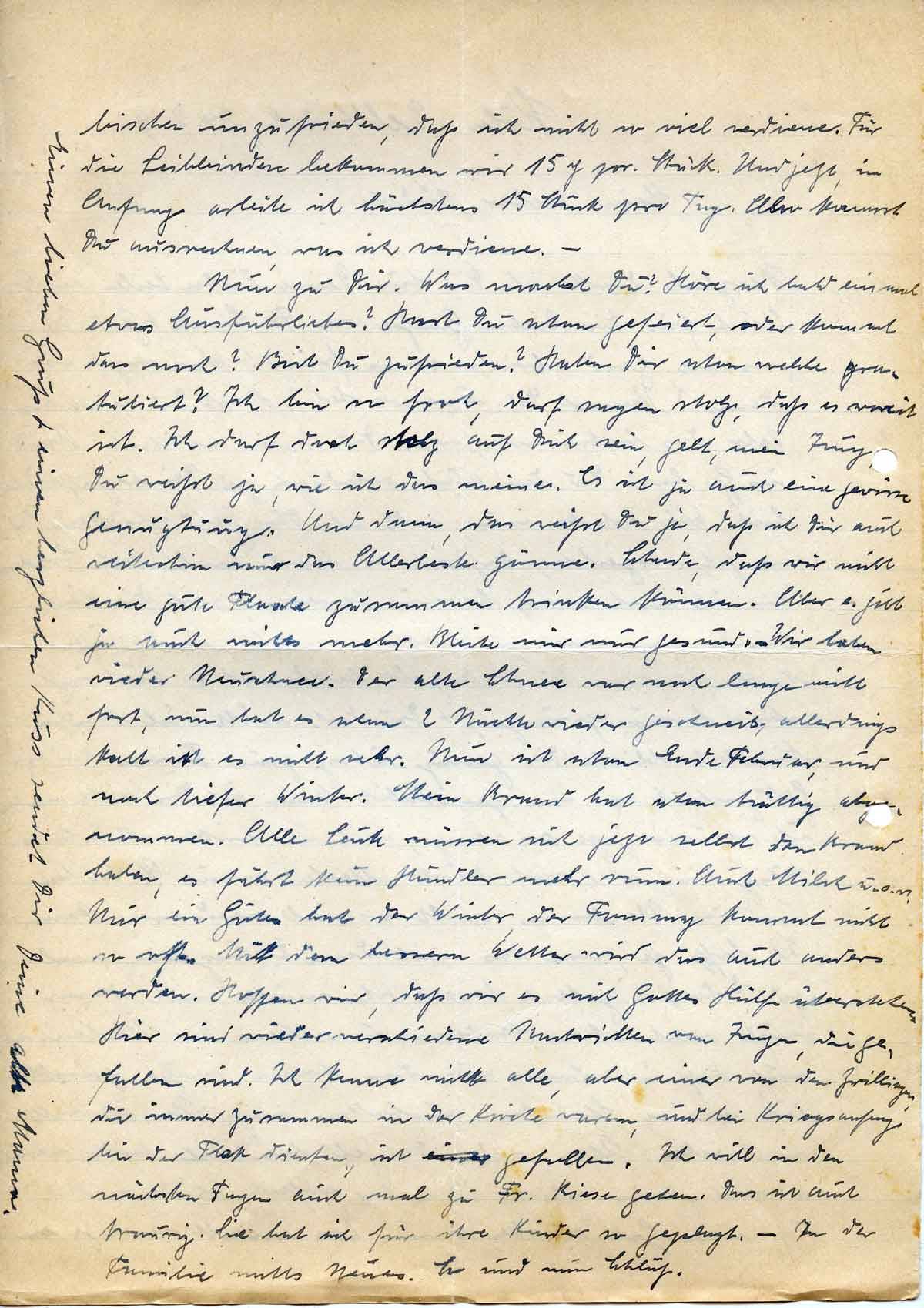 Nun zu Dir. Was machst Du? Höre ich bald einmal etwas Ausführliches? Hast Du schon gefeiert, oder kommt das noch? Bist Du zufrieden? Haben Dir schon welche gratuliert? Ich bin so froh, darf sagen stolz, daß es soweit ist. Ich darf doch stolz auf Dich sein, gelt, mein Junge. Du weißt ja, wie ich das meine. Es ist ja auch eine gewisse Genugtuung. Und dann, das weißt Du ja, daß ich Dir auch weiterhin nur das Allerbeste gönne. Schade, daß wir nicht eine gute Flasche zusammen trinken können. Aber es gibt ja auch nichts mehr. Bleibe mir nur gesund. – Wir haben wieder Neuschnee. Der alte Schnee war noch lange nicht fort, nun hat es schon 2 Nächte wieder geschneit; allerdings kalt ist es nicht sehr. Nun ist schon Ende Februar, und noch tiefer Winter. Mein Brand hat schon tüchtig abgenommen. Alle Leute müssen sich jetzt selbst den Brand holen, es fährt kein Händler mehr rum. Auch Milch u.s.w. Nur ein Gutes hat der Winter, der Tommy kommt nicht so oft. Mit dem besseren Wetter wird das auch anders werden. Hoffen wir, daß wir es mit Gottes Hilfe überstehen. Hier sind wieder verschiedene Nachrichten von Jungen, die gefallen sind. Ich kenne nicht alle, aber einer von den Zwillingen, die immer zusammen in der Kirche waren, und bei Kriegsanfang bei der Flotte dienten, ist gefallen. Ich will in den nächsten Tagen auch mal zu Fr. Riese gehen. Das ist auch traurig. Sie hat sich für ihre Kinder so geplagt. – In der Familie nichts Neues. So und nun Schluß.