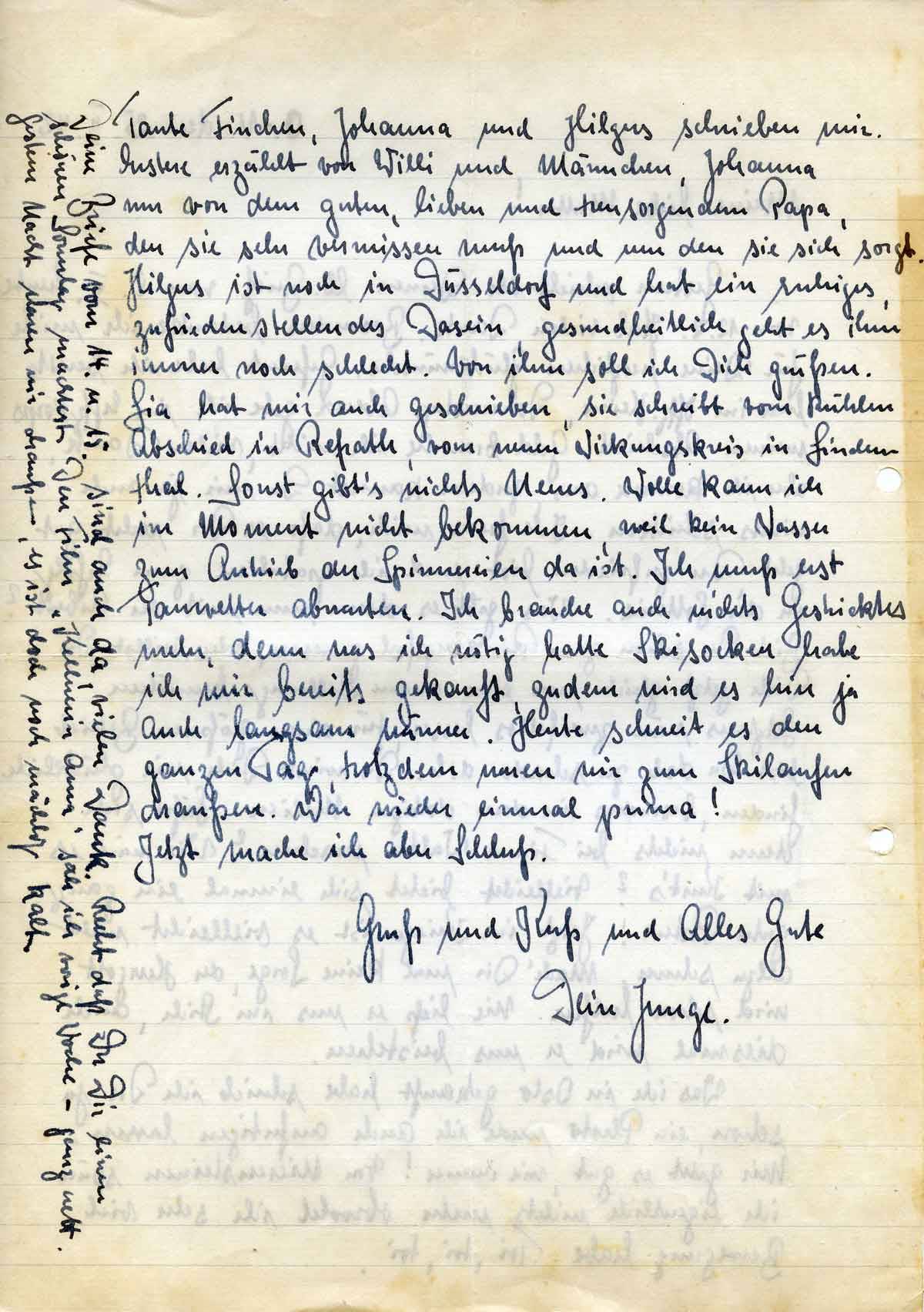 Tante Finchen, Johanna und Hilgers schrieben mir. Erstere erzählt von Willi und Männchen, Johanna nur von dem guten, lieben und treusorgenden Papa, den sie sehr vermissen muß und um den sie sich sorgt. Hilgers ist noch in Düsseldorf und hat ein ruhiges, zufriedenstellendes Dasein, gesundheitlich geht es ihm immer noch schlecht. Von ihm soll ich Dich grüßen. Lia hat mir auch geschrieben, sie schreibt vom kühlen Abschied in Refrath, vom neuen Wirkungskreis in Lindenthal. Sonst gibt’s nichts Neues. Wolle kann ich im Moment nicht bekommen, weil kein Wasser zum Antrieb der Spinnereien da ist. Ich muß erst Tauwetter abwarten. Ich brauche auch nichts Gestricktes mehr, denn was ich nötig hatte Skisocken habe ich mir bereits gekauft, zudem wird es hier ja auch langsam wärmer. Heute schneit es den ganzen Tag, trotzdem waren wir zum Skilaufen draußen. War wieder einmal prima!