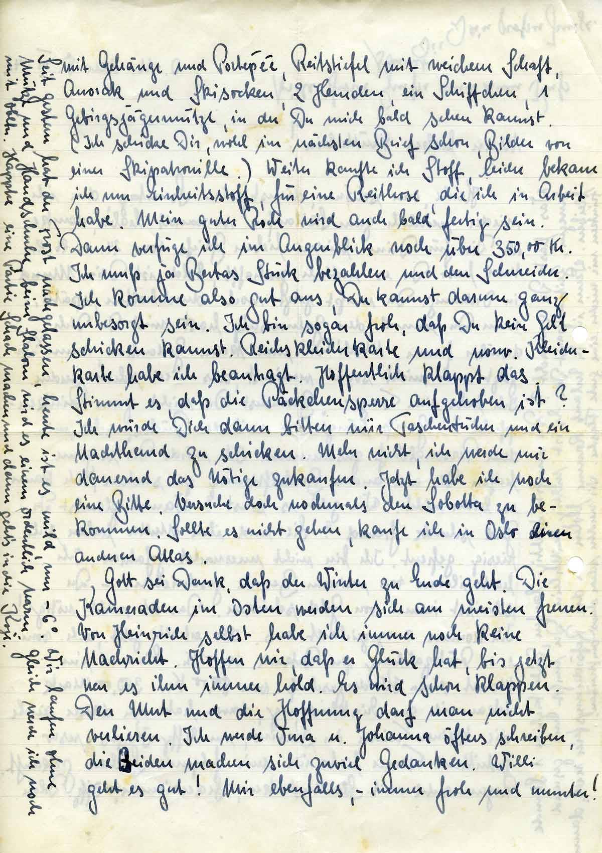 mit Gehänge und Portepée, Reitstiefel mit weichem Schaft, Anorak und Skisocken, 2 Hemden, ein Schiffchen, 1 Gebirgsjägermütze, in der Du mich bald sehen kannst. (Ich schicke Dir, wohl im nächsten Brief schon, Bilder von einer Skipatrouille.) Weiter kaufte ich Stoff, leider bekam ich nur Einheitsstoff, für eine Reithose, die ich in Arbeit habe. Mein guter Rock wird auch bald fertig sein. Dann verfüge ich im Augenblick noch über 350,00 Kr. Ich muß ja Bertas Stück bezahlen und den Schneider. Ich komme also gut aus, Du kannst darum ganz unbesorgt sein. Ich bin sogar froh, daß Du kein Geld schicken kannst. Reichskleiderkarte und norw. Kleiderkarte habe ich beantragt. Hoffentlich klappt das. Stimmt es, daß die Päckchensperre aufgehoben ist? Ich würde Dich dann bitte mir Taschentücher und ein Nachthemd zu schicken. Mehr nicht, ich werde mir dauernd das Nötige zukaufen. Jetzt habe ich noch eine Bitte. Versuche doch nochmals den Sobotta zu bekommen. Sollte es nicht gehen, kaufe ich in Oslo einen anderen Atlas.