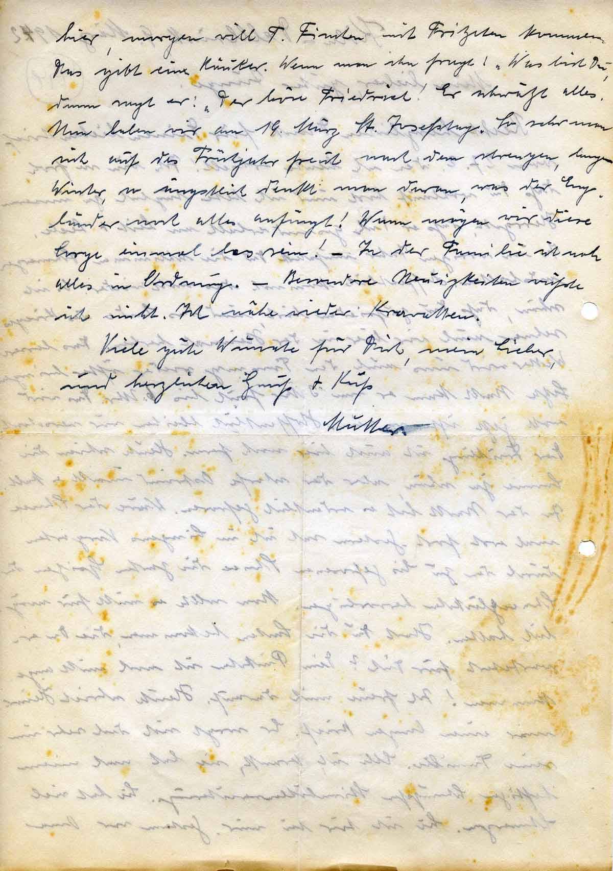 hier, morgen will T. Finchen mit Fritzchen kommen. Das gibt ein Räuber. Wenn man ihn fragt: „Was bist Du, dann sagt er: „Der böse Friedrich! Er schwätzt alles. Nun haben wir am 19. März St. Josefstag. So sehr man sich auf das Frühjahr freut nach dem strengen, langen Winter, so ängstlich denkt man daran, was der Engländer noch alles anfängt! Wann mögen wir diese Sorge einmal los sein! – In der Familie ist noch alles in Ordnung. – Besondere Neuigkeiten wüßte ich nicht. Ich nähe wieder Krawatten.