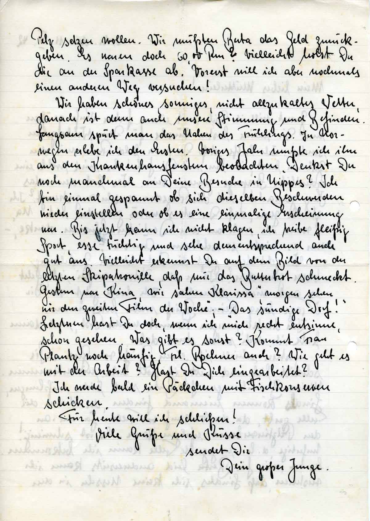 Wir haben schönes, sonniges, nicht allzu kaltes Wetter, danach ist denn auch unsere Stimmung und Befinden. Langsam spürt man das Nahen des Frühlings. In Norwegen erlebe ich den Ersten. Voriges Jahr mußte ich ihn aus den Krankenhausfenstern beobachten. Denkst Du noch manchmal an Deine Besuche in Nippes? Ich bin einmal gespannt ob sich dieselben Beschwerden wieder einstellen oder ob es eine einmalige Erscheinung war. Bis jetzt kann ich nicht klagen, ich treibe fleißig Sport, esse tüchtig und sehe dementsprechend auch gut aus. Vielleicht erkennst Du auf dem Bild von der letzten Skipatrouille, daß mir das Butterbrot schmeckt. Gestern war Kino, wir sahen „Klarissa“, morgen sehen wir den zweiten Film der Woche; - „Das sündige Dorf!“ Letzteren hast Du doch, wenn ich mich recht entsinne, schon gesehen. Was gibt es sonst? Kommt Frau Plantz noch häufig, Frl. Boehner auch? Wie geht es mit der Arbeit? Hast Du Dich eingearbeitet?