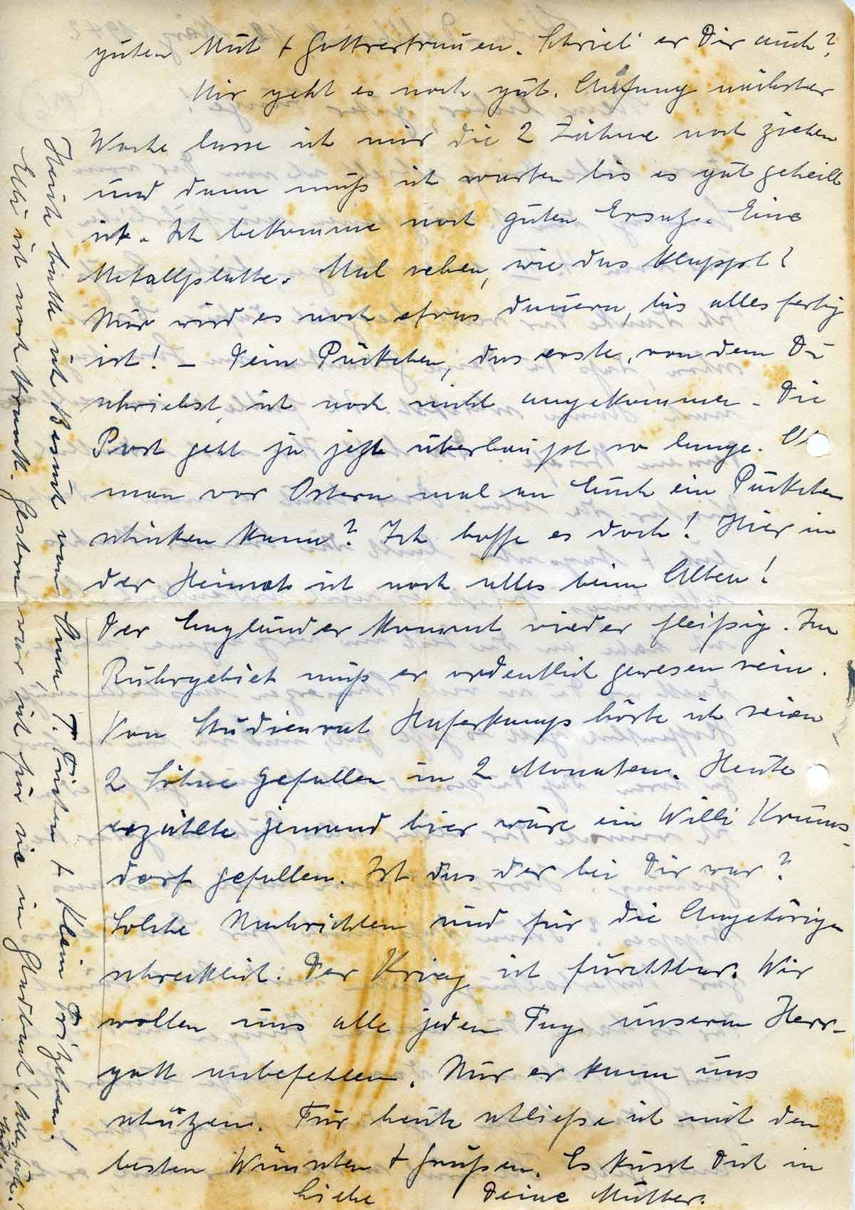 Der Engländer kommt wieder fleißig. Im Ruhrgebiet muß er ordentlich gewesen sein. Von Studienrat Haferkamp hörte ich seien 2 Söhne gefallen in 2 Monaten. Heute erzählte jemand hier wäre ein Willi Krumsdorf gefallen. Ist das der bei Dir war? Solche Nachrichten sind für die Angehörigen schrecklich. Der Krieg ist furchtbar. Wir wollen uns alle jeden Tag unserm Herrgott anbefehlen. Nur er kann uns schützen. Für heute schließe ich mit den besten Wünschen + Grüßen. Es küsst Dich in Liebe