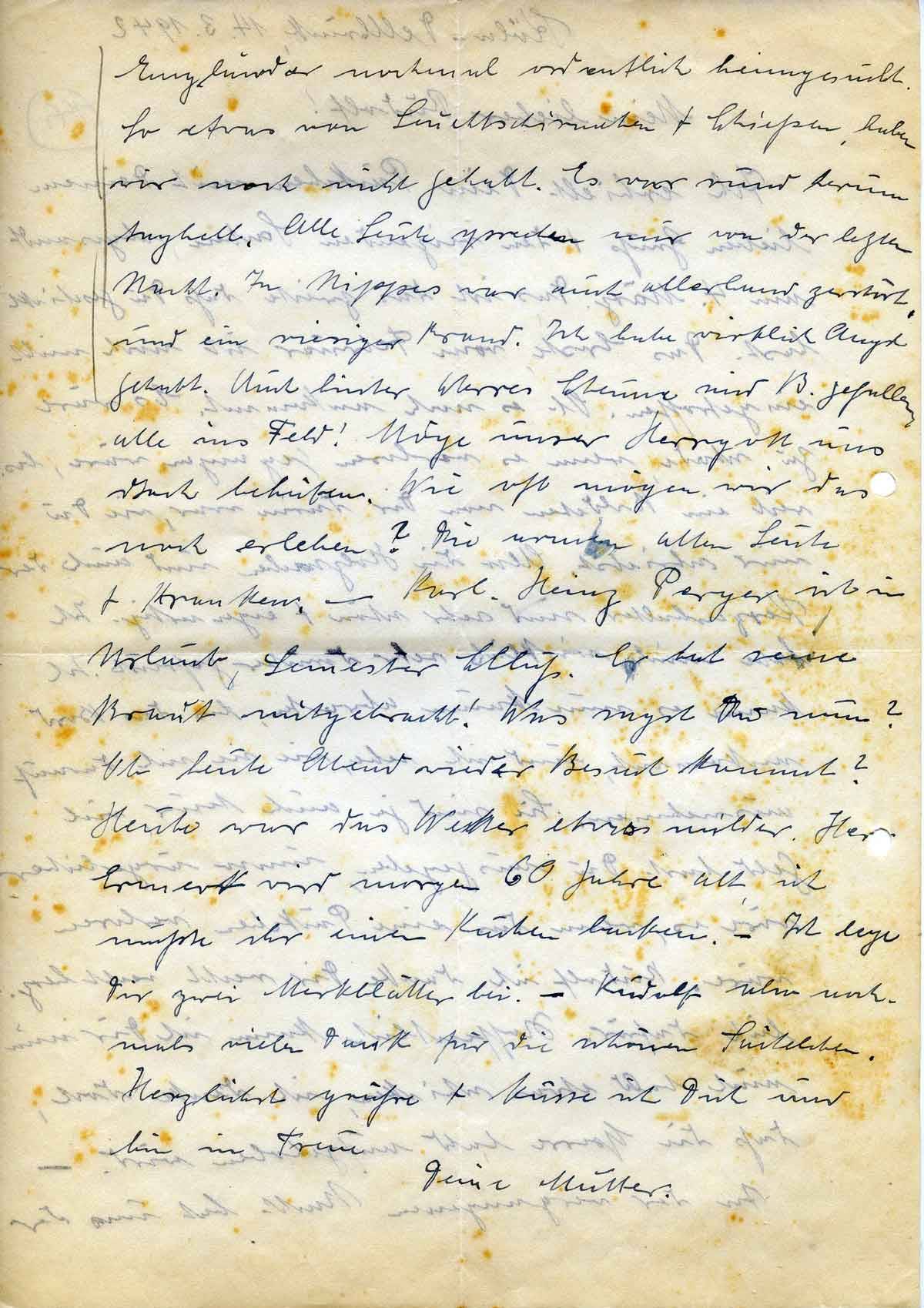 Engländer nochmal ordentlich heimgesucht. So etwas von Leuchtschirmchen + Schießen haben wir noch nicht gehabt. Es war rund herum taghell. Alle Leute sprechen nur von der letzten Nacht. In Nippes war auch allerhand zerstört, und ein riesiger Brand. Ich habe wirklich Angst gehabt. Auch hinter Werres Scheune sind B. gefallen alle ins Feld! Möge unser Herrgott uns doch behüten. Wie oft mögen wir das noch erleben? Die armen alten Leute + Kranken. – Karl-Heinz Perger ist in Urlaub, Semester Schluß. Er hat seine Braut mitgebracht! Was sagst Du nun? Ob heute Abend wieder Besuch kommt? Heute war das Wetter etwas milder. Herr Ermert wird morgen 60 Jahre alt, ich mußte ihr einen Kuchen backen. – Ich lege Dir zwei Merkblätter bei. – Rudolf also nochmals vielen Dank für die schönen Sächelchen.