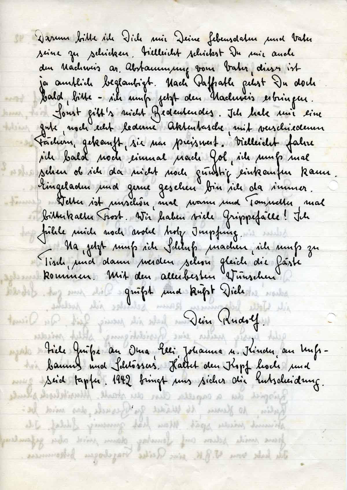 Viele Grüße an Oma, Elli, Johanna u. Kinder, an Nußbaums und Schlössers. Haltet den Kopf hoch und seid tapfer. 1942 bringt uns sicher die Entscheidung.
