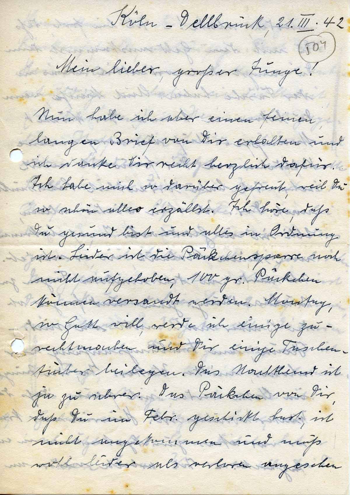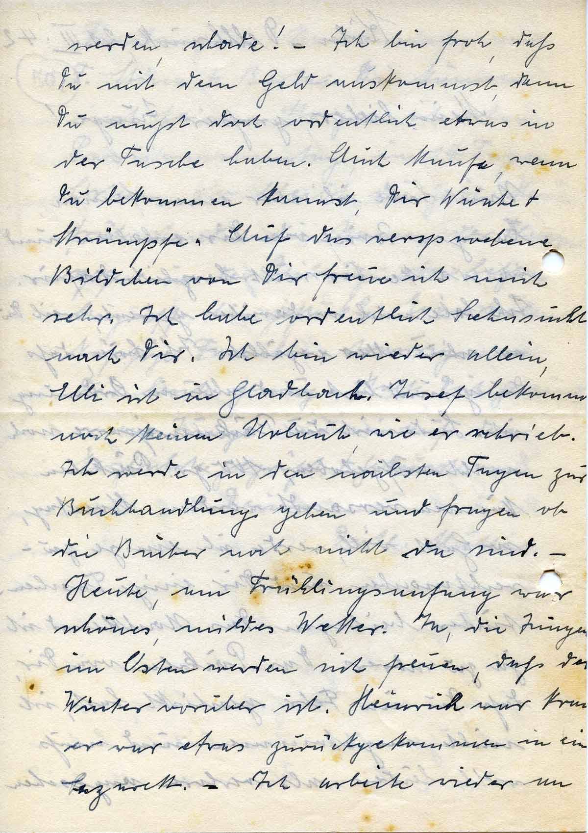 werden, schade! – Ich bin froh, daß Du mit dem Geld auskommst, denn Du mußt doch ordentlich etwas in der Tasche haben. Auch kaufe, wenn Du bekommen kannst, Dir Wäsche + Strümpfe. Auf das versprochene Bildchen von Dir freue ich mich sehr. Ich habe ordentlich Sehnsucht nach Dir. Ich bin wieder allein, Elli ist in Gladbach. Josef bekommt noch keinen Urlaub, wie er schrieb. Ich werde in den nächsten Tagen zur Buchhandlung gehen und fragen ob die Bücher noch nicht da sind. – Heute, am Frühlingsanfang war schönes, mildes Wetter. Ja, die Jungen im Osten werden sich freuen, daß der Winter vorüber ist. Heinrich war krank, er war etwas zurückgekommen in ein Lazarett. – Ich arbeite wieder an