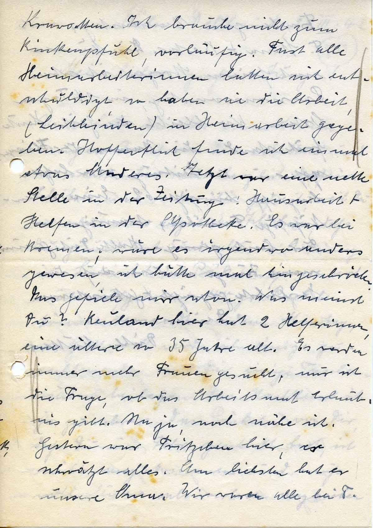 Krawatten. Ich brauche nicht zum Rinkenpfuhl, vorläufig. Fast alle Heimarbeiterinnen hatten sich entschuldigt, so haben sie die Arbeit, (Leibbinden) in Heimarbeit gegeben. Hoffentlich finde ich einmal etwas Anderes. Jetzt war eine nette Stelle in der Zeitung: Hausarbeit + Helfen in der Apotheke. Es war bei Bremen; wäre es irgendwo anders gewesen, ich hätte mal hingeschrieben. Das gefiele mir schon. Was meinst Du? Reuland hier hat 2 Helferinnen, eine ältere so 35 Jahre alt. Es werden immer mehr Frauen gesucht, nur ist die Frage, ob das Arbeitsamt Erlaubnis gibt. Na ja, noch nähe ich.