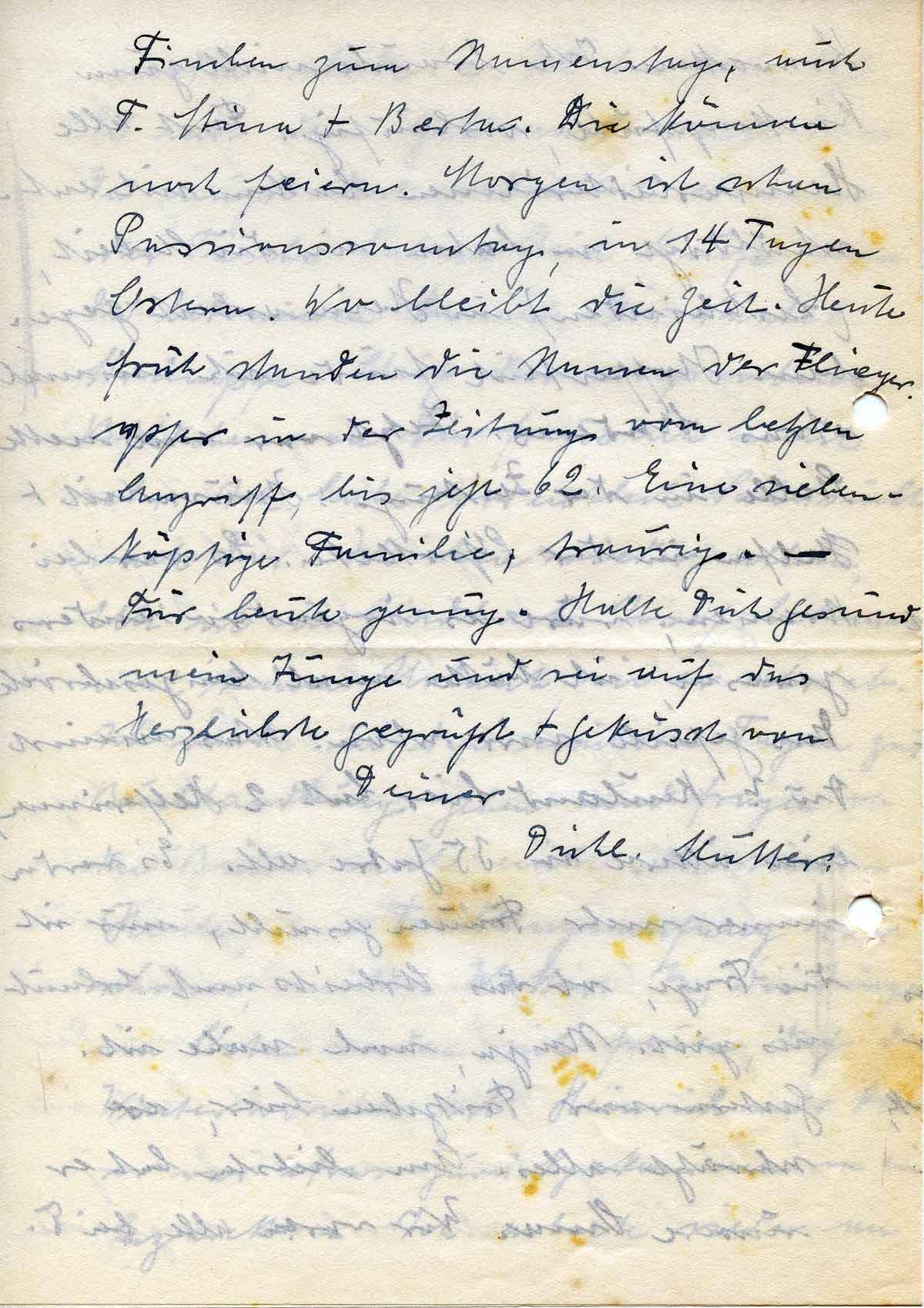 Finchen zum Namenstag, auch T. Stina + Berta. Die können noch feiern. Morgen ist schon Passionssonntag, in 14 Tagen Ostern. Wo bleibt die Zeit. Heute früh standen die Namen der Fliegeropfer in der Zeitung vom letzten Angriff, bis jetzt 62. Eine siebenköpfige Familie, traurig. –