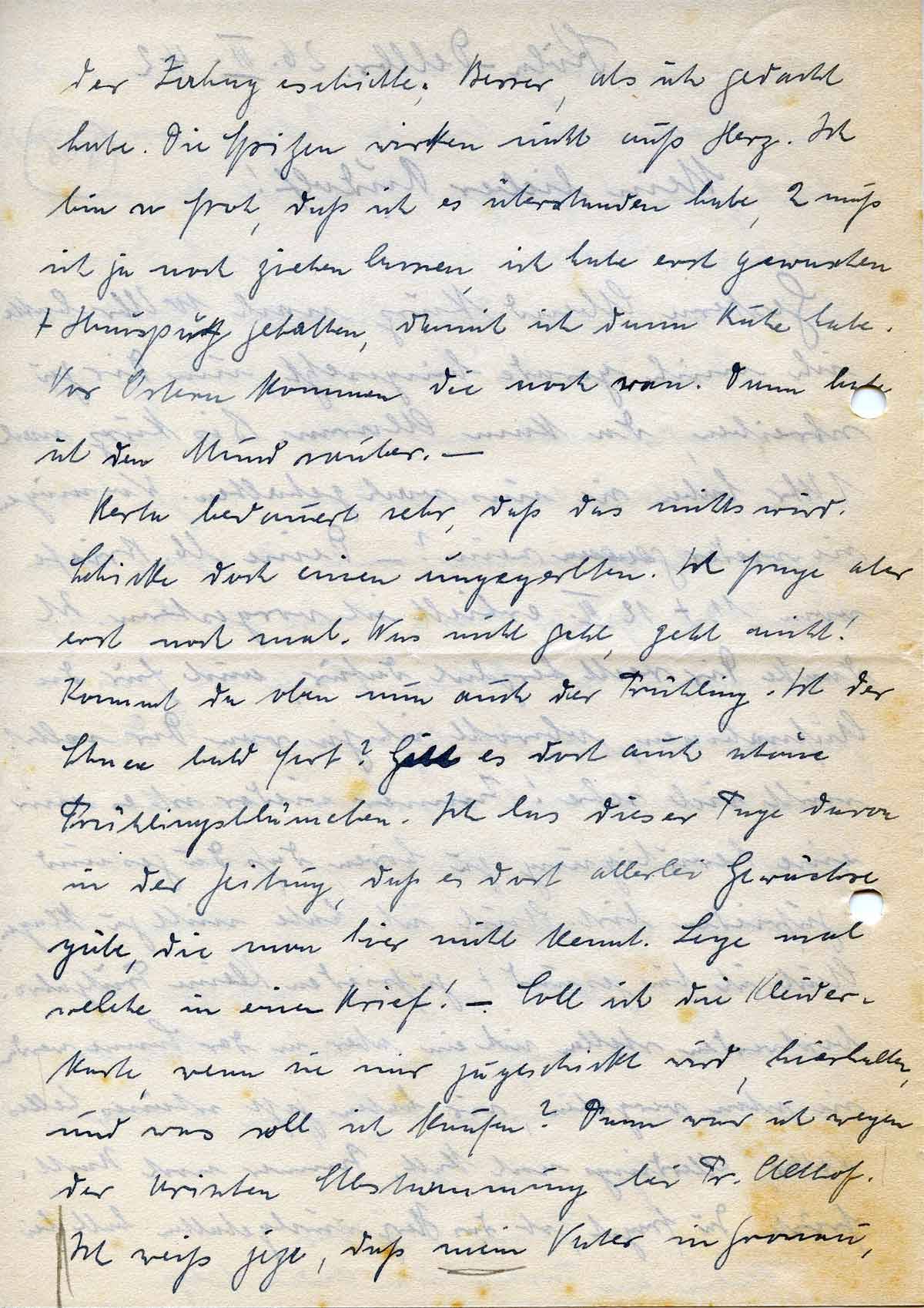Gestern Abend kurz nach 10 Uhr hatte ich mich gerade hingesetzt, um Dir zu schreiben, da kam Alarm. Bis kurz nach 1 Uhr haben sie uns wach gehalten. Wo mögen sie wieder gewesen sein? – Deine lb. Briefe vom 11. + 12.III. erhielt ich vorgestern. Ich danke Dir recht herzlich dafür, auch für die Aufnahmen, obwohl ich ja von Dir selbst nicht viel sehe! Immer wieder ist es mir eine Beruhigung zu hören, daß Du gesund + zufrieden bist. Auch ich habe nicht zu klagen. Auch ich bin gesund + zufrieden. Kleine Frühjahrsbeschwerden stellen sich ein, aber in der Sonne werden sie schon vergehen, wir haben jetzt schönes, helles Wetter, allerdings noch kalt. Immer noch Nachtfröste. Du fragst, ob das Herz durchgehalten hat bei