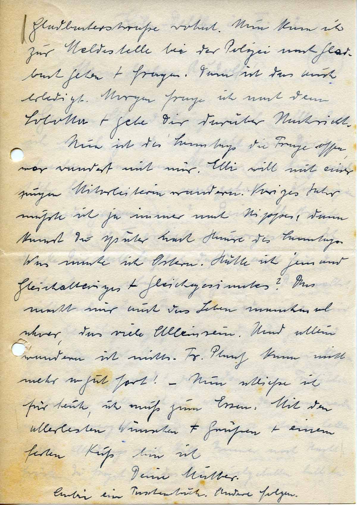 Nun ist des Sonntags die Frage offen, wer wandert mit mir. Elli will mit einer jungen Mitarbeiterin wandern. Voriges Jahr mußte ich ja immer nach Nippes, dann kamst Du später nach Hause des Sonntags. Was mache ich Ostern. Hätte ich jemand Gleichalteriges + Gleichgesinntes? Das macht mir auch das Leben manchmal schwer, das viele Alleinsein. Und allein wandern ist nichts. Fr. Plantz kann nicht mehr so gut fort! – Nun schließe ich für heute, ich muß zum Essen. Mit den allerbesten Wünschen + Grüßen + einem festen Kuß bin ich
