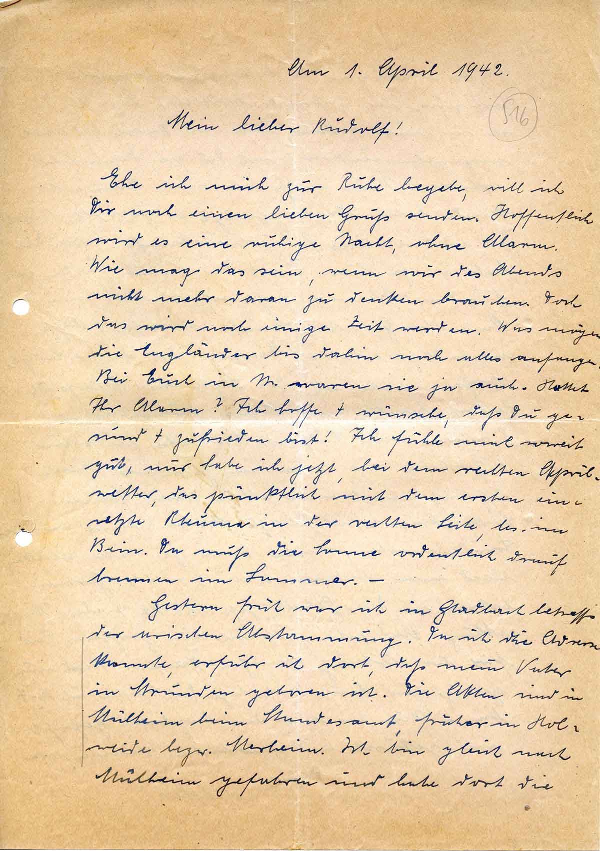 Anna Schmitz an ihren Sohn Rudolf, 1. April 1942