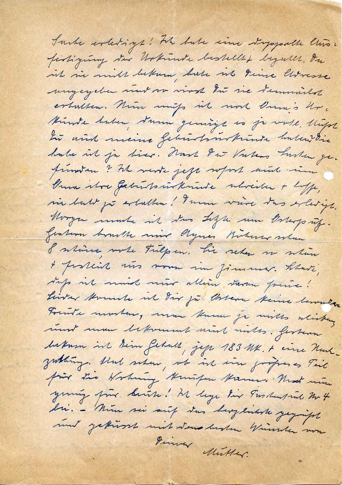 Sache erledigt! Ich habe eine doppelte Ausfertigung der Urkunde bestellt + bezahlt. Da ich sie nicht bekam, habe ich Deine Adresse angegeben und so wirst Du sie demnächst erhalten. Nun muß ich noch Oma’s Urkunde haben, dann genügt es ja wohl. Mußt Du auch meine Geburtsurkunde haben? Die habe ich ja hier. Hast Du Vaters Sachen gefunden? Ich werde jetzt sofort auch um Oma ihre Geburtsurkunde schreiben + hoffe, sie bald zu erhalten! Dann wäre das erledigt. Morgen mache ich das Letzte am Osterputz. Gestern brachte mir Agnes Böhner schon 8 schöne, rote Tulpen. Sie sehen so schön + festlich aus vorn im Zimmer. Schade, daß ich mich nur allein daran freue! Leider konnte ich Dir zu Ostern keine besondere Freude machen, man kann ja nichts schicken und man bekommt auch nichts. Gestern bekam ich Dein Gehalt, jetzt 183 Mk. + eine Nachzahlung. Mal sehen, ob ich ein größeres Teil für die Wohnung kaufen kann. Und nun genug für heute! Ich lege Dir Taschentuch No 4 bei. – Nun sei auf das herzlichste gegrüßt und geküsst mit den besten Wünschen von