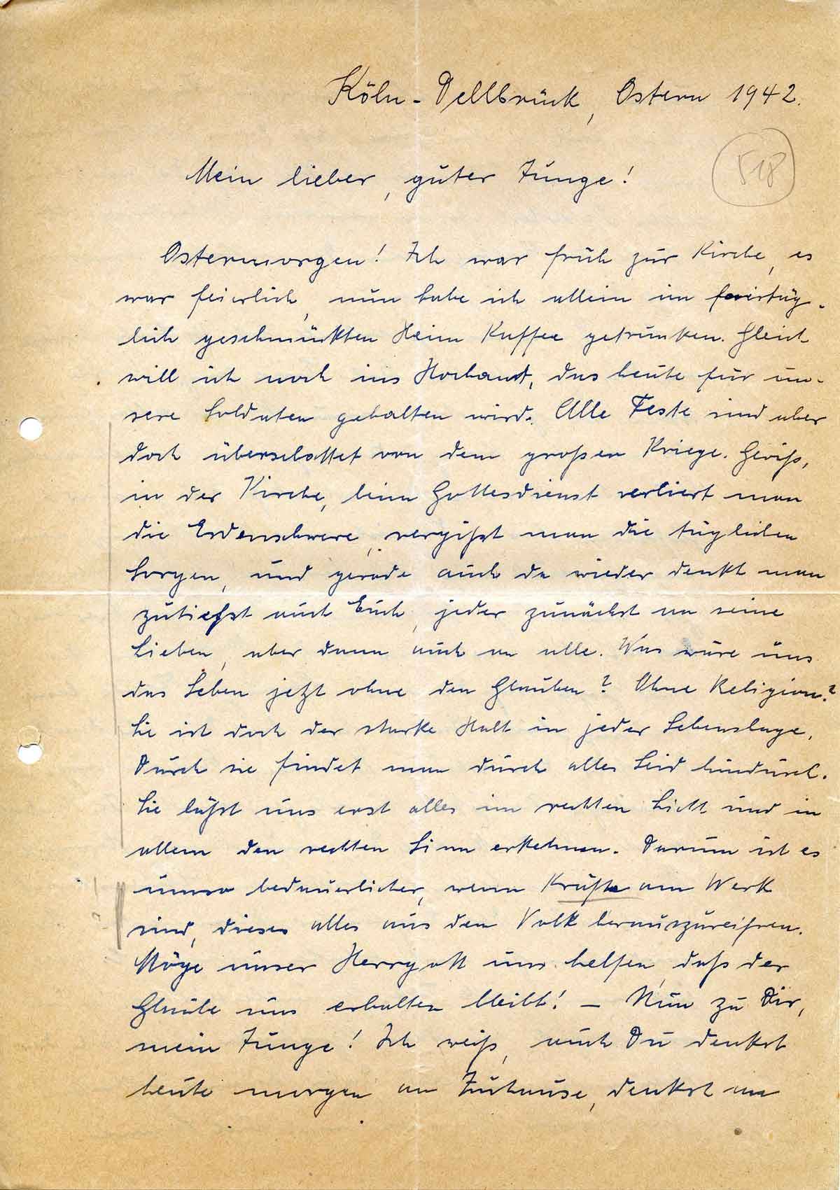 Ostermorgen! Ich war früh zur Kirche, es war feierlich, nun habe ich allein im feiertäglich geschmückten Heim Kaffee getrunken. Gleich will ich noch ins Hochamt, das heute für unsere Soldaten gehalten wird. Alle Feste sind aber doch überschattet von dem großen Kriege. Gewiß, in der Kirche, beim Gottesdienst verliert man die Erdenschwere, vergißt man die täglichen Sorgen, und gerade auch da wieder denkt man zutiefst auch Euch, jeder zunächst an seine Lieben, aber dann auch an alle. Was wäre uns das Leben jetzt ohne den Glauben? Ohne Religion? Sie ist doch der starke Halt in jeder Lebenslage. Durch sie findet man durch alles Leid hindurch. Sie läßt uns erst alles im rechten Licht und in allem den rechten Sinn erkennen. Darum ist es umso bedauerlicher, wenn Kräfte am Werk sind, dieses alles aus dem Volk herauszureißen. Möge unser Herrgott uns helfen, daß der Glaube uns erhalten bleibt! – Nun zu Dir, mein Junge! Ich weiß, auch Du denkst heute morgen an Zuhause, denkst an