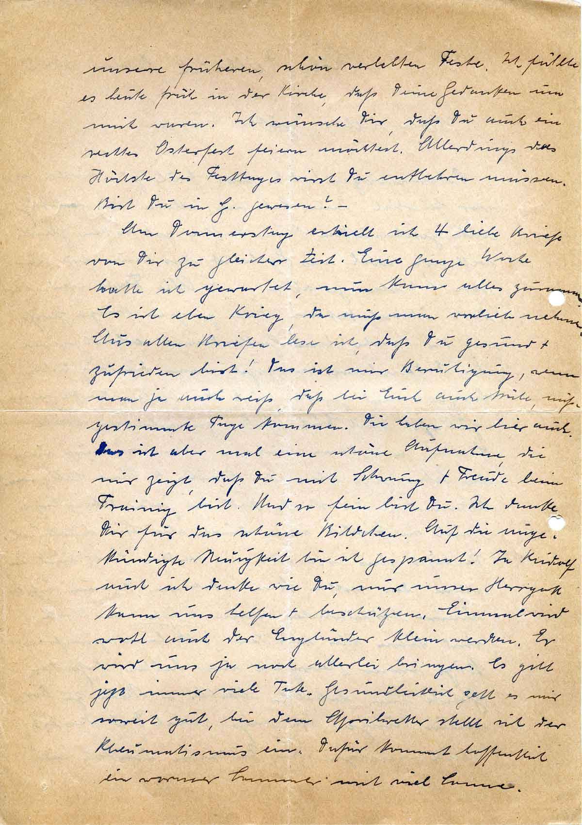 Am Donnerstag erhielt ich 4 liebe Briefe von Dir zu gleicher Zeit. Eine ganze Woche hatte ich gewartet, nun kam alles zusammen. Es ist eben Krieg, da muß man vorlieb nehmen. Aus allen Briefen lese ich, daß Du gesund + zufrieden bist! Das ist mir Beruhigung, wenn man ja auch weiß, daß bei Euch auch trübe, mißgestimmte Tage kommen. Die haben wir hier auch. Das ist aber mal eine schöne Aufnahme, die mir zeigt, daß Du mit Schwung + Freude beim Training bist. Und so fein bist Du. Ich danke Dir für das schöne Bildchen. Auf die angekündigte Neuigkeit bin ich gespannt! Ja Rudolf auch ich denke wie Du, nur unser Herrgott kann uns helfen + beschützen. Einmal wird wohl auch der Engländer klein werden. Er wird uns ja noch allerlei bringen. Es gibt jetzt immer viele Tote. Gesundheitlich geht es mir soweit gut, bei dem Aprilwetter stellt sich der Rheumatismus ein. Dafür kommt hoffentlich ein warmer Sommer mit viel Sonne.