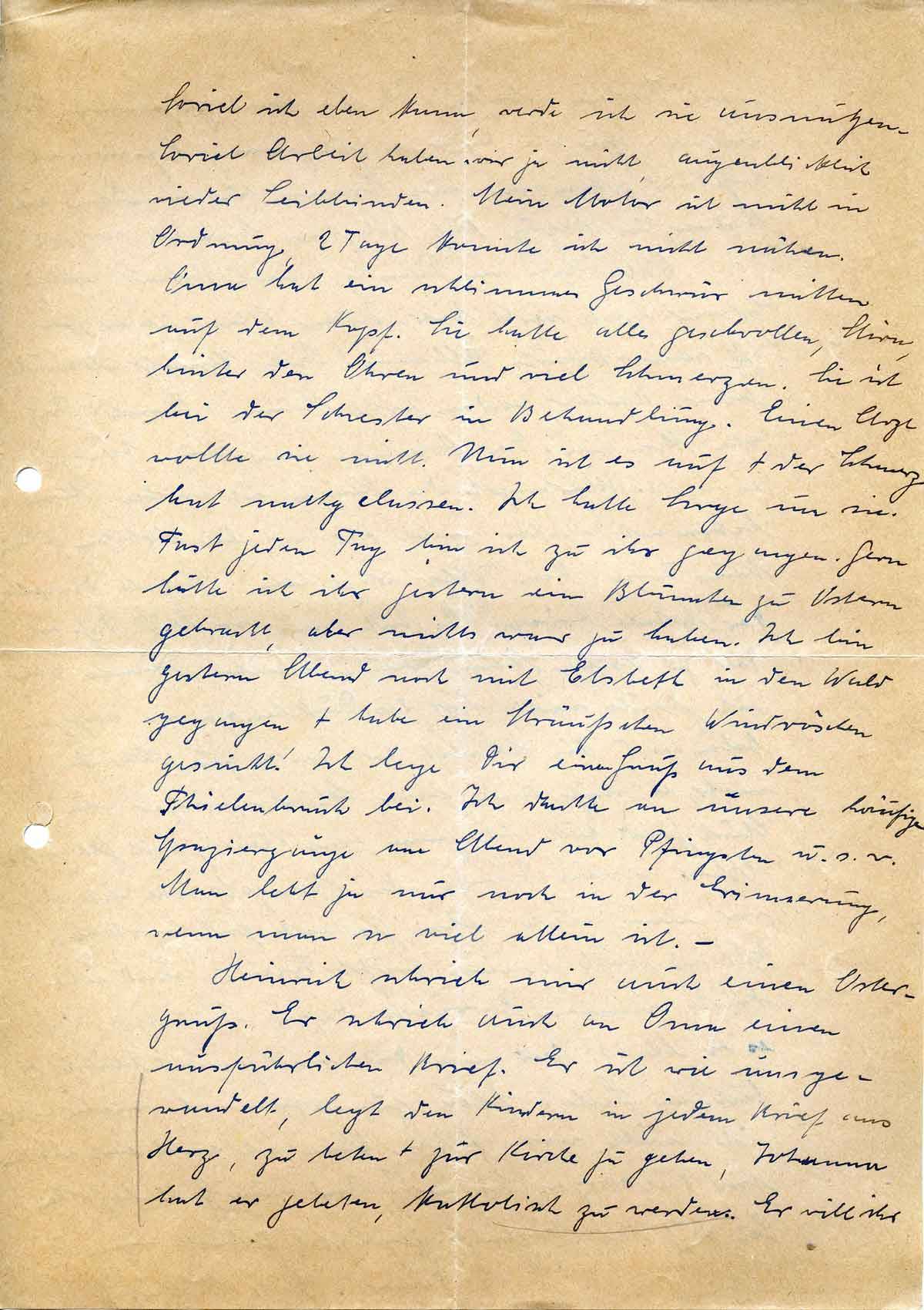 Heinrich schrieb mir auch einen Ostergruß. Er schrieb auch an Oma einen ausführlichen Brief. Er ist wie ausgewandelt, legt den Kindern in jedem Brief ans Herz, zu beten + zur Kirche zu gehen, Johanna hat er gebeten, katholisch zu werden. Er will ihr