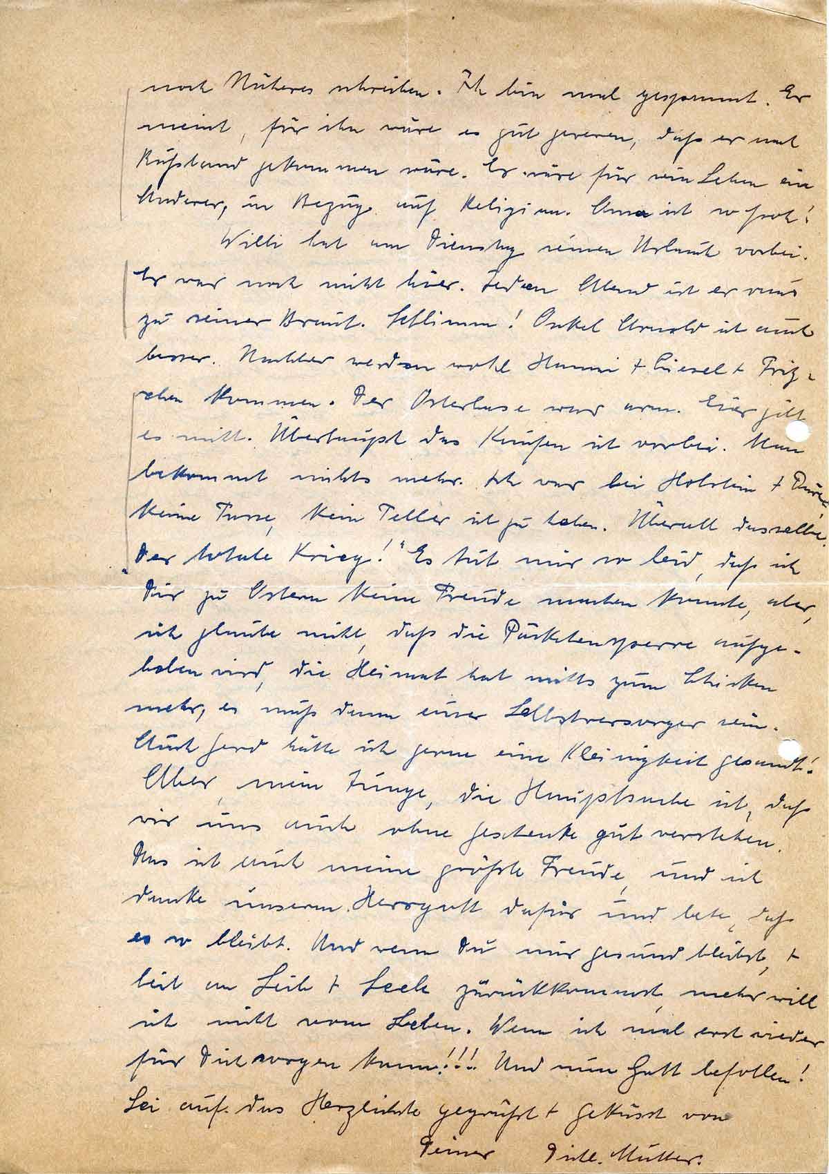Willi hat am Dienstag seinen Urlaub vorbei. Er war noch nicht hier. Jeden Abend ist er raus zu seiner Braut. Schlimm! Onkel Arnold ist auch besser. Nachher werden wohl Hanni + Liesel + Fritzchen kommen. Der Osterhase war arm. Eier gibt es nicht. Überhaupt dass Kaufen ist vorbei. Man bekommt nichts mehr. Ich war bei Holstein + Dürer, keine Tasse, kein Teller ist zu haben. Überall dasselbe. „Der totale Krieg!“ Es tut mir so leid, daß ich Dir zu Ostern keine Freude machen konnte, aber, ich glaube nicht, daß die Päckchensperre aufgehoben wird, die Heimat hat nichts zum Schicken mehr, es muß dann einer Selbstversorger sein. Auch Gerd hätte ich gerne eine Kleinigkeit gesandt! Aber mein Junge, die Hauptsache ist, daß wir uns auch ohne Geschenk gut verstehen. Das ist auch meine größte Freude, und ich danke unserm Herrgott dafür und bete, daß es so bleibt. Und wenn Du mir gesund bleibst, + heil an Leib + Seele zurückkommst, mehr will ich nicht vom Leben. Wenn ich mal erst wieder für Dich sorgen kann!!! Und nun Gott befohlen! Sei auf das Herzlichste gegrüßt + geküsst von