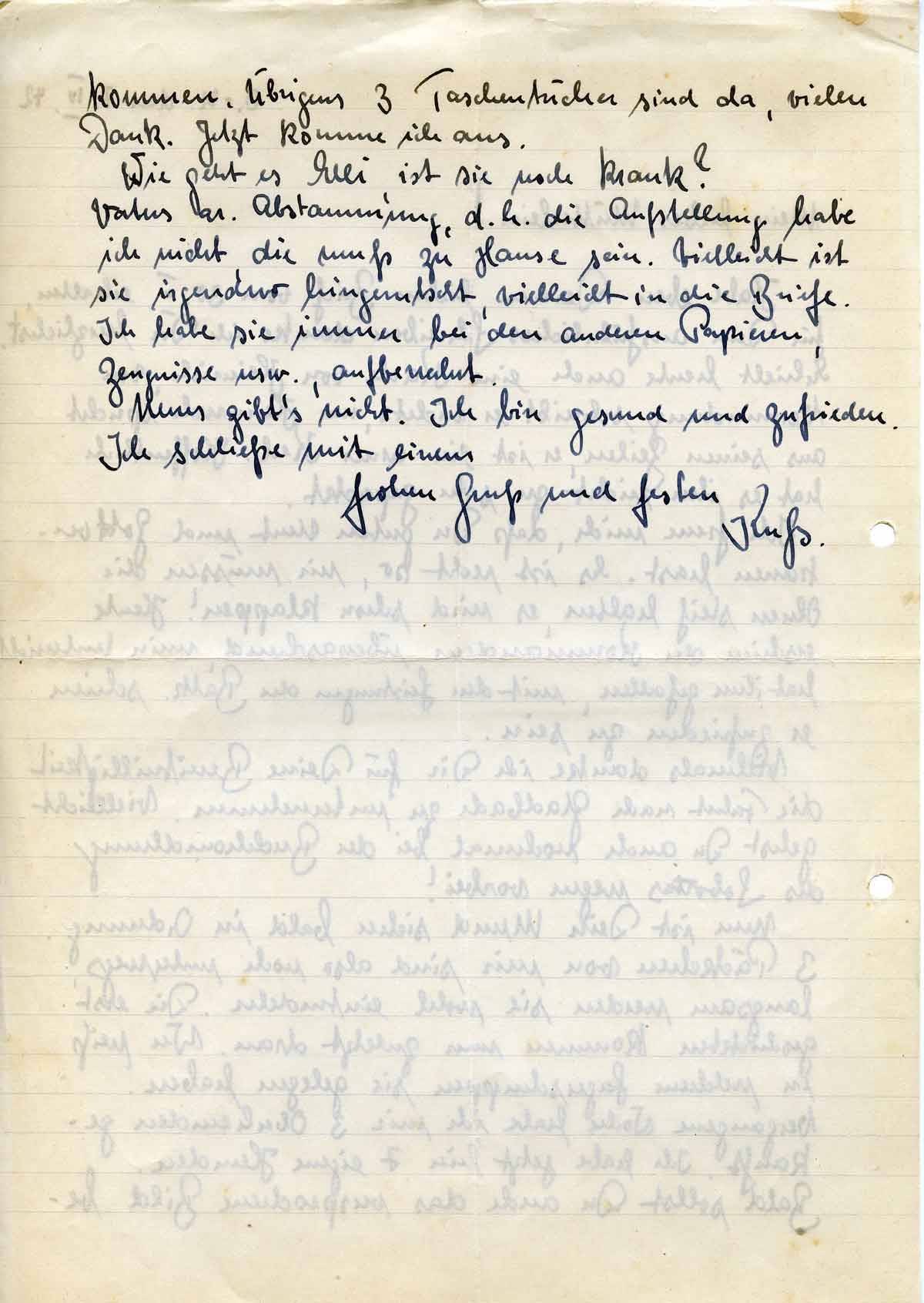 Nun ist Dein Mund sicher bald in Ordnung. 3 Päckchen von mir sind also noch unterwegs, langsam werden sie wohl eintrudeln. Die erst geschickten kommen nun zuletzt dran. Wer weiß in welchem Lagerschuppen sie gelegen haben. Vergangene Woche habe ich mir 3 Oberhemden gekauft. Ich habe jetzt hier 7 eigene Hemden. Bald sollst Du auch das versprochene Bild be-