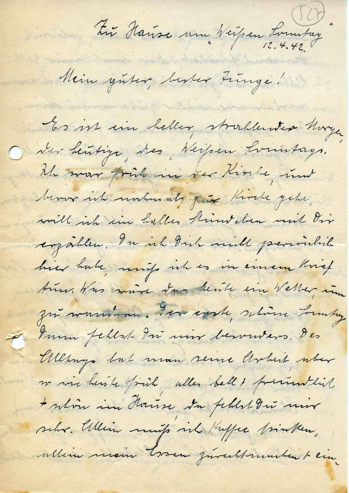 Es ist ein heller, strahlender Morgen, der heutige des „Weißen Sonntags. Ich war früh in der Kirche, und bevor ich nochmals zur Kirche gehe, will ich ein halbes Stündchen mit Dir erzählen. Da ich Dich nicht persönlich hier habe, muß ich es in einem Brief tun. Was wäre das heute ein Wetter, um zu wandern. Der erste, schöne Sonntag. Dann fehlst Du mir besonders. Des Alltags hat man seine Arbeit, aber so wie heute früh, alles hell + freundlich + schön im Hause, da fehlst Du mir sehr. Allein muß ich Kaffee trinken, allein mein Essen zurechtmachen + ein-